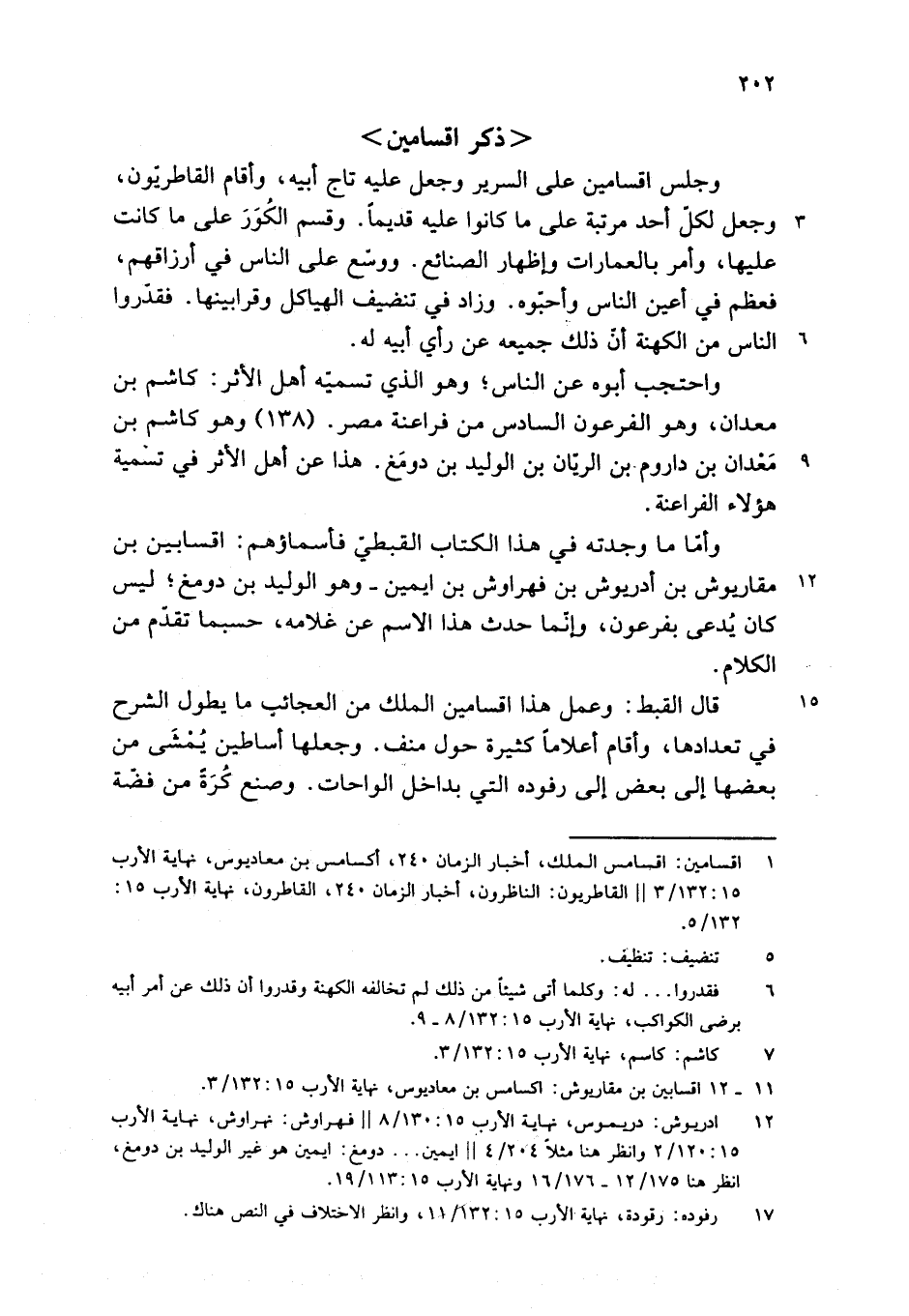 وأمّا ما وجدته في هذا الكتاب القبطيّ فأسماؤهم: اقسابين بن مقاريوش بن أدريوش بن فهراوش بن ايمين-وهو الوليد بن دومغ؛ ليس كان يدعى بفرعون، وإنّما حدث هذا الاسم عن غلامه، حسبما تقدّم من الكلام.