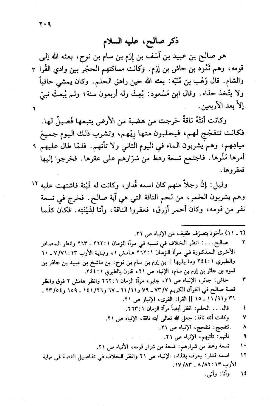 هو صالح بن عبيد بن آسف بن إرم بن سام بن نوح، بعثه الله إلى قومه، وهم ثمود بن حاش بن إرم. وكانت مساكنهم الحجر بين وادي القرا والشام. قال وهب بن منبّه: بعثه الله حين راهق الحلم. وكان يمشي حافيا ولا يتّخذ حذاء. وقال ابن مسعود: بعث وله أربعون سنة؛ ولم يبعث نبيّ إلاّ بعد الأربعين.