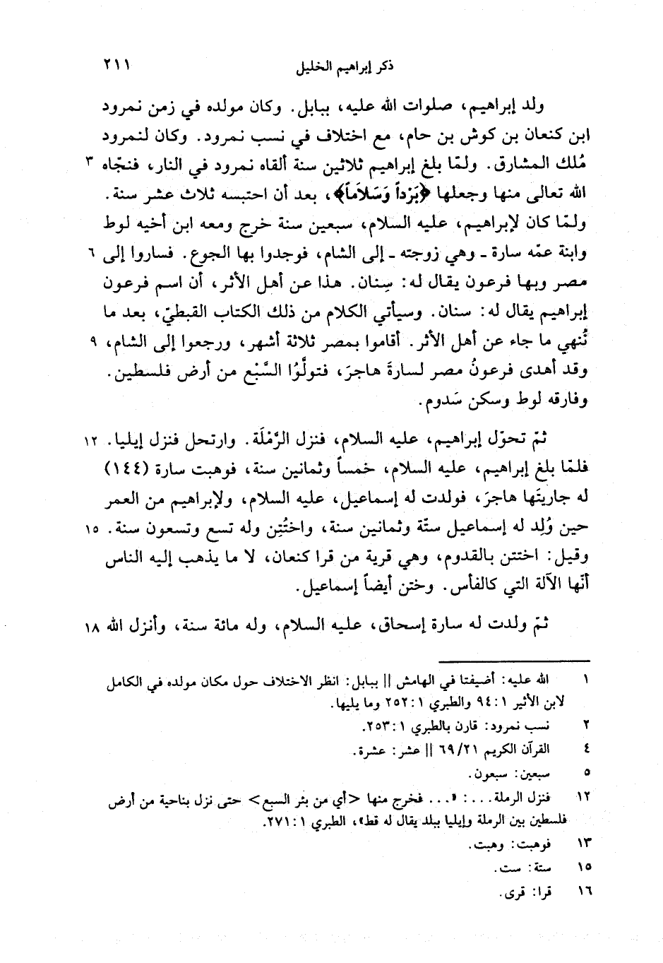فلمّا بلغ إبراهيم، عليه السلام، خمسا وثمانين سنة، فوهبت سارة (144) له جاريتها هاجر، فولدت له إسماعيل، عليه السلام، ولإبراهيم من العمر حين ولد له إسماعيل ستّة وثمانين سنة، واختتن وله تسع وتسعون سنة.