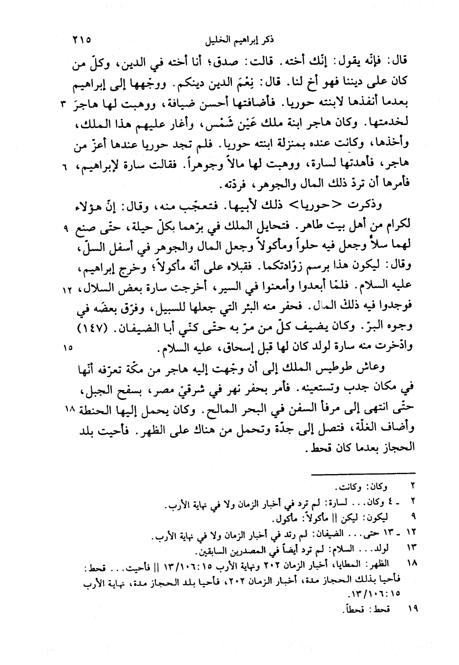 قال: فإنّه يقول: إنّك أخته. قالت: صدق؛ أنا أخته في الدين، وكلّ من كان على ديننا فهو أخ لنا. قال: نعم الدين دينكم. ووجّهها إلى إبراهيم بعدما أنفذها لابنته حوريا. فأضافتها أحسن ضيافة، ووهبت لها هاجر لخدمتها. وكان هاجر ابنة ملك عين شمس، وأغار عليهم هذا الملك، وأخذها، وكانت عنده بمنزلة ابنته حوريا. فلم تجد حوريا عندها أعزّ من هاجر، فأهدتها لسارة، ووهبت لها مالا وجوهرا. فقالت سارة لإبراهيم، فأمرها أن تردّ ذلك المال والجوهر، فردّته.