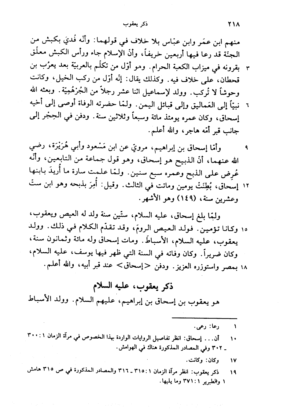 منهم ابن عمر وابن عبّاس بلا خلاف في قولهما: وأنّه فدي بكبش من الجنّة قد رعا فيها أربعين خريفا، وأنّ الإسلام جاء ورأس الكبش معلّق بقرونه في ميزاب الكعبة الحرام. وهو أوّل من تكلّم بالعربيّة بعد يعرب بن قحطان، على خلاف فيه. وكذلك يقال: إنّه أوّل من ركب الخيل، وكانت وحوشا لا تركب. وولد لإسماعيل اثنا عشر رجلا من الجرهميّة. وبعثه الله نبيّا إلى العماليق وإلى قبائل اليمن. ولمّا حضرته الوفاة أوصى إلى أخيه إسحاق، وكان عمره يومئذ مائة وسبعا وثلاثين سنة. ودفن في الحجر إلى جانب قبر أمّه هاجر، والله أعلم.