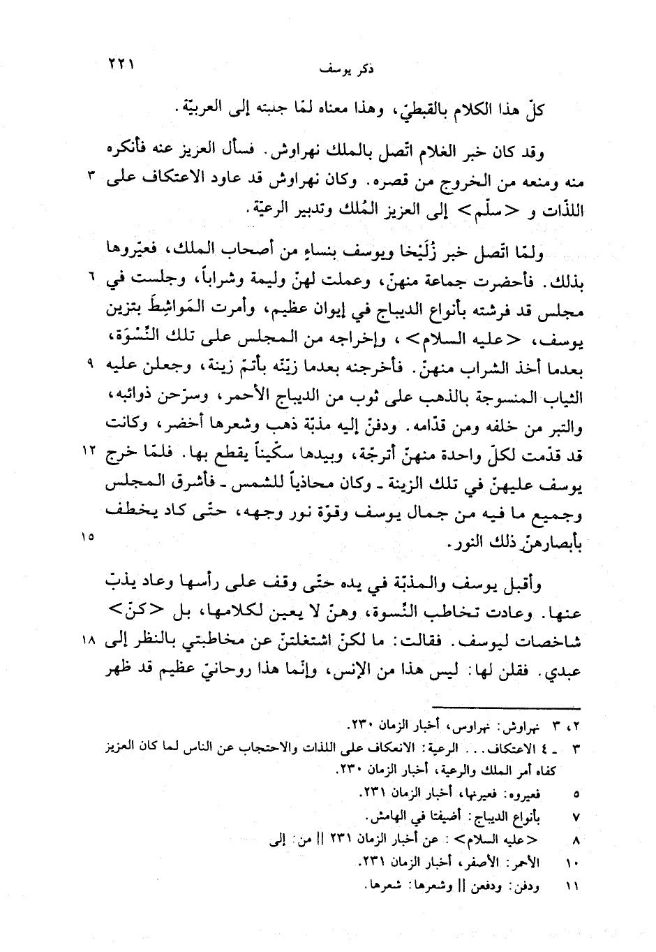 وأقبل يوسف والمذبّة في يده حتّى وقف على رأسها وعاد يذبّ عنها. وعادت تخاطب النّسوة، وهنّ لا يعين لكلامها، بل <كنّ> شاخصات ليوسف. فقالت: ما لكنّ اشتغلتنّ عن مخاطبتي بالنظر إلى عبدي. فقلن لها: ليس هذا من الإنس، وإنّما هذا روحانيّ عظيم قد ظهر