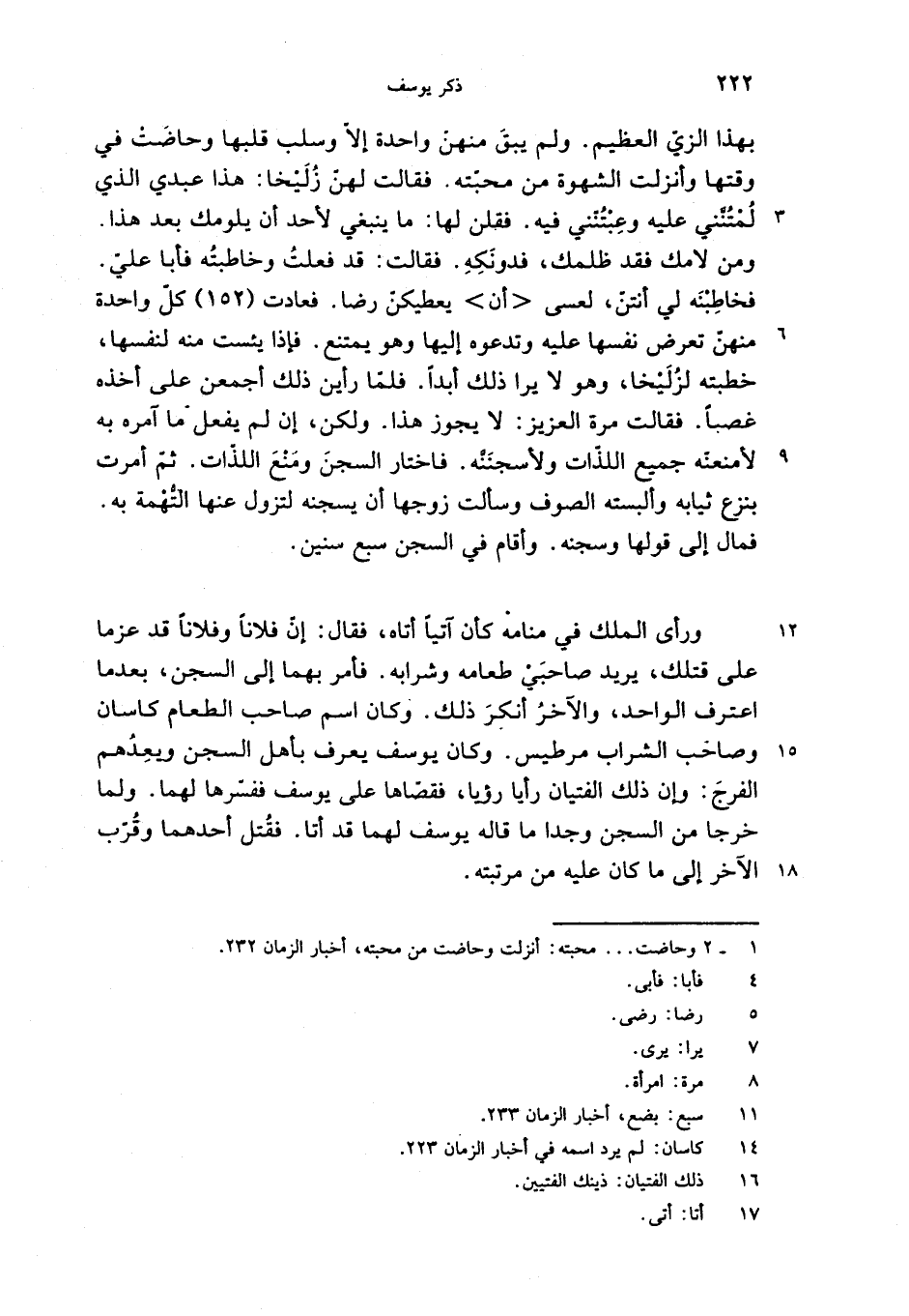 فخاطبنه لي أنتنّ، لعسى <أن> يعطيكنّ رضا. فعادت (152) كلّ واحدة منهنّ تعرض نفسها عليه وتدعوه إليها وهو يمتنع. فإذا يئست منه لنفسها، خطبته لزليخا، وهو لا يرا ذلك أبدا. فلمّا رأين ذلك أجمعن على أخذه غصبا. فقالت مرة العزيز: لا يجوز هذا. ولكن، إن لم يفعل ما آمره به لأمنعنّه جميع اللذّات ولأسجننّه. فاختار السجن ومنع اللذّات. ثمّ أمرت بنزع ثيابه وألبسته الصوف وسألت زوجها أن يسجنه لتزول عنها التّهمة به.