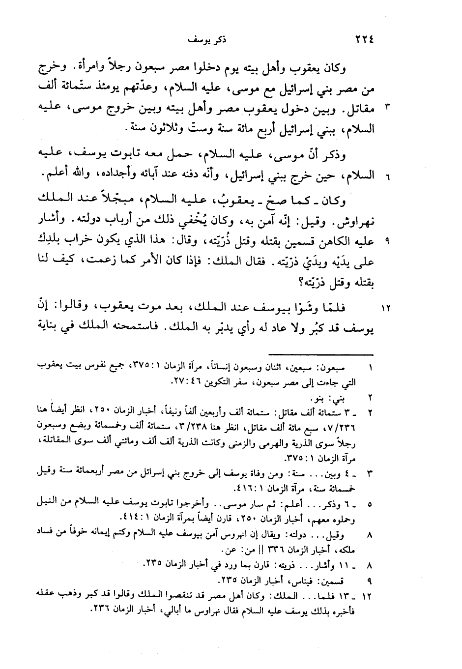 وكان يعقوب وأهل بيته يوم دخلوا مصر سبعون رجلا وامرأة. وخرج من مصر بني إسرائيل مع موسى، عليه السلام، وعدّتهم يومئذ ستّمائة ألف مقاتل. وبين دخول يعقوب مصر وأهل بيته وبين خروج موسى، عليه السلام، ببني إسرائيل أربع مائة سنة وستّ وثلاثون سنة.