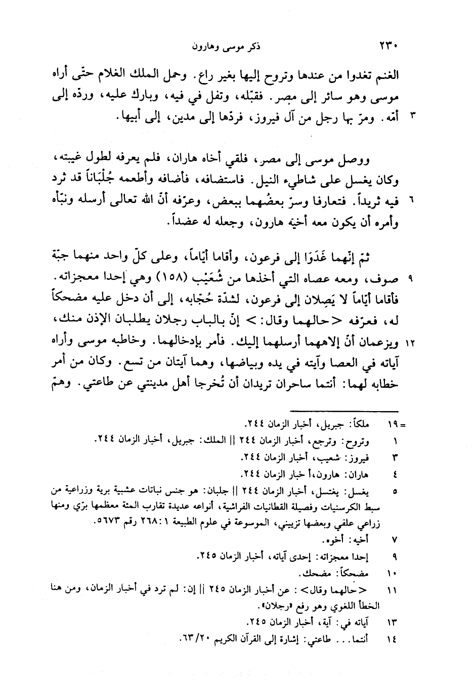 الغنم تغدوا من عندها وتروح إليها بغير راع. وحمل الملك الغلام حتّى أراه موسى وهو سائر إلى مصر. فقبّله، وتفل في فيه، وبارك عليه، وردّه إلى أمّه. ومرّ بها رجل من آل فيروز، فردّها إلى مدين، إلى أبيها.