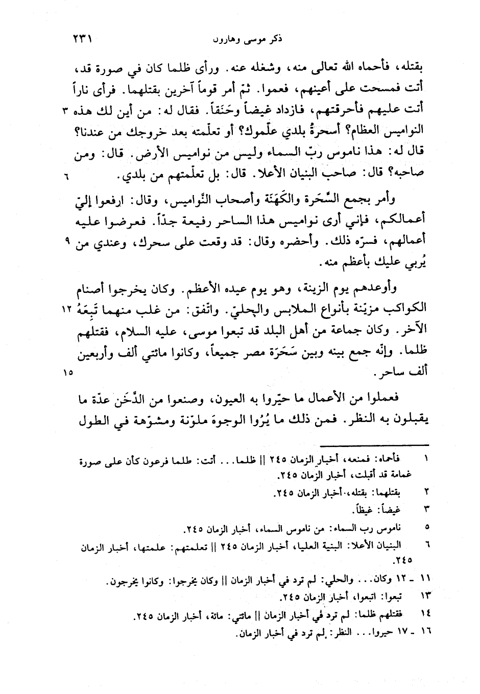 وأمر بجمع السّحرة والكهنة وأصحاب النّواميس، وقال: ارفعوا إليّ أعمالكم، فإني أرى نواميس هذا الساحر رفيعة جدّا. فعرضوا عليه أعمالهم، فسرّه ذلك. وأحضره وقال: قد وقعت على سحرك، وعندي من يربي عليك بأعظم منه.