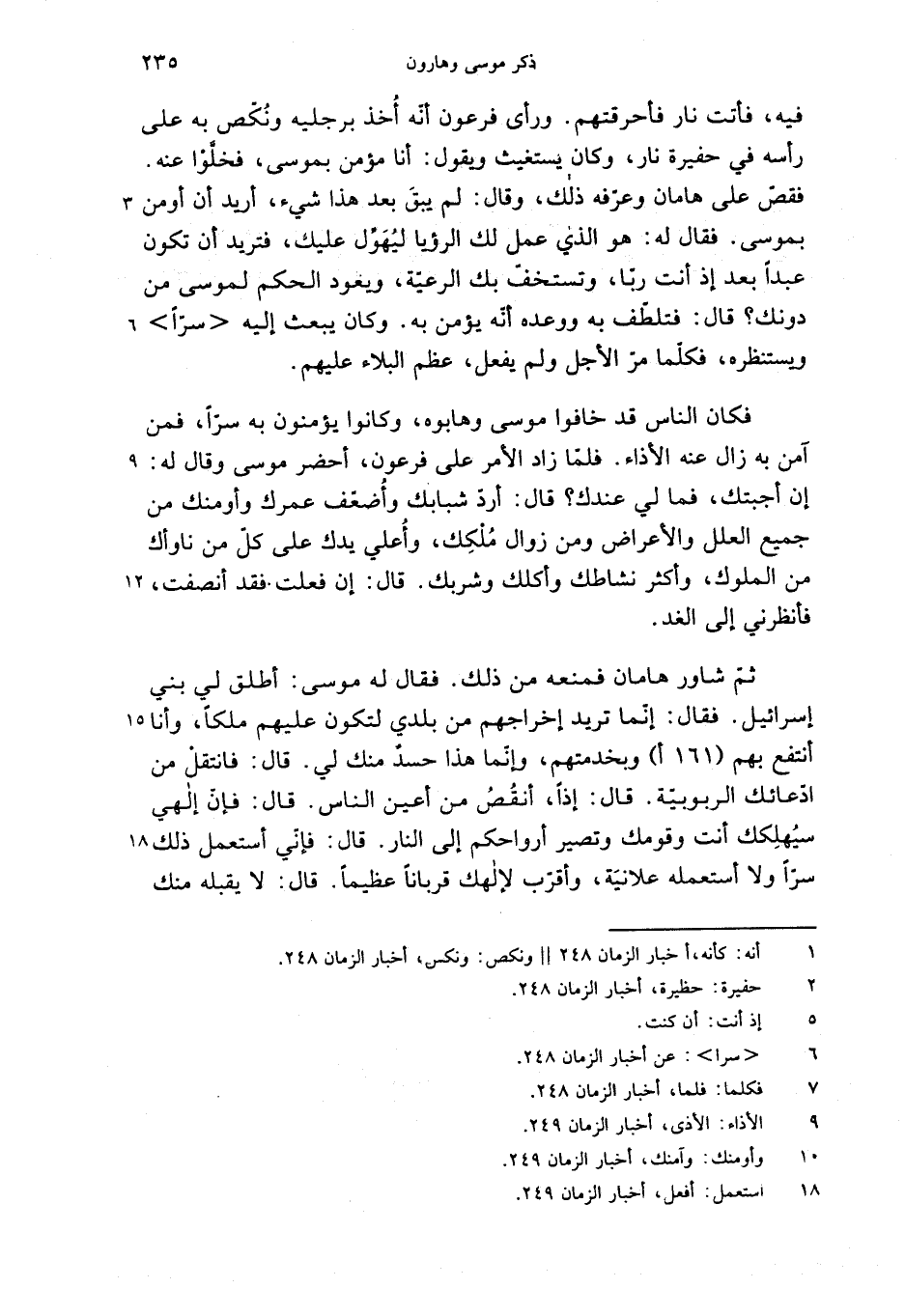 ثمّ شاور هامان فمنعه من ذلك. فقال له موسى: أطلق لي بني إسرائيل. فقال: إنّما تريد إخراجهم من بلدي لتكون عليهم ملكا، وأنا أنتفع بهم (161 أ) وبخدمتهم، وإنّما هذا حسد منك لي. قال: فانتقل من ادّعائك الربوبيّة. قال: إذا، أنقص من أعين الناس. قال: فإنّ إلهي سيهلكك أنت وقومك وتصير أرواحكم إلى النار. قال: فإنّي أستعمل ذلك سرّا ولا أستعمله علانيّة، وأقرّب لإلهك قربانا عظيما. قال: لا يقبله منك