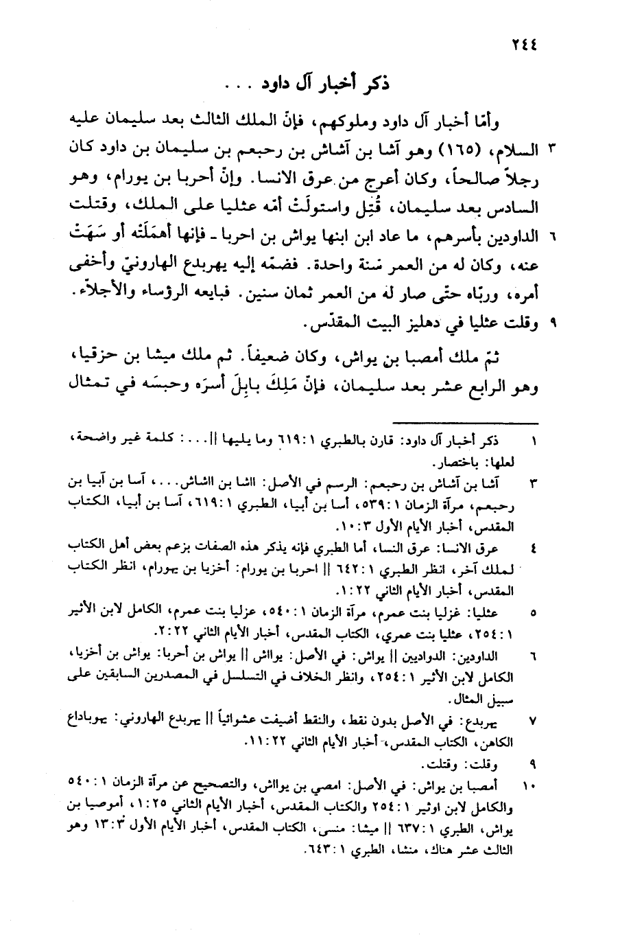 وأمّا أخبار آل داود وملوكهم، فإنّ الملك الثالث بعد سليمان عليه السلام، (165) وهو آشا بن آشاش بن رحبعم بن سليمان بن داود كان رجلا صالحا، وكان أعرج من عرق الانسا. وإنّ أحربا بن يورام، وهو السادس بعد سليمان، قتل واستولت أمّه عثليا على الملك، وقتلت الداودين بأسرهم، ما عاد ابن ابنها يواش بن احربا-فإنها أهملته أو سهت عنه، وكان له من العمر سنة واحدة. فضمّه إليه يهربدع الهارونيّ وأخفى أمره، وربّاه حتّى صار له من العمر ثمان سنين. فبايعه الرؤساء والأجلاّء.