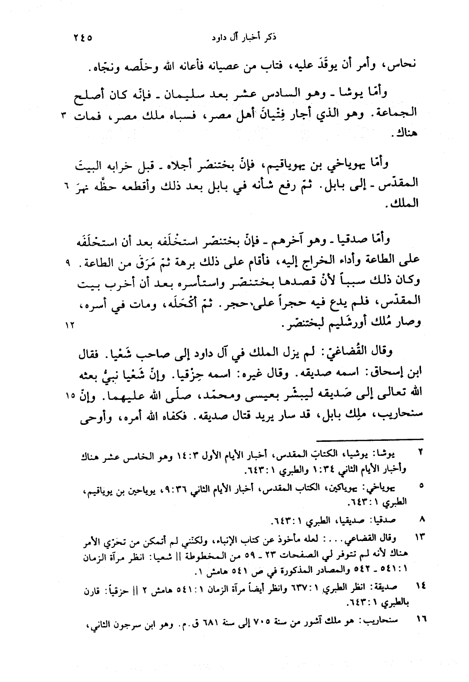 وقال القضاعيّ: لم يزل الملك في آل داود إلى صاحب شعيا. فقال ابن إسحاق: اسمه صديقه. وقال غيره: اسمه حزقيا. وإنّ شعيا نبيّ بعثه الله تعالى إلى صديقه ليبشّر بعيسى ومحمّد، صلّى الله عليهما. وإنّ سنحاريب، ملك بابل، قد سار يريد قتال صديقه. فكفاه الله أمره، وأوحى