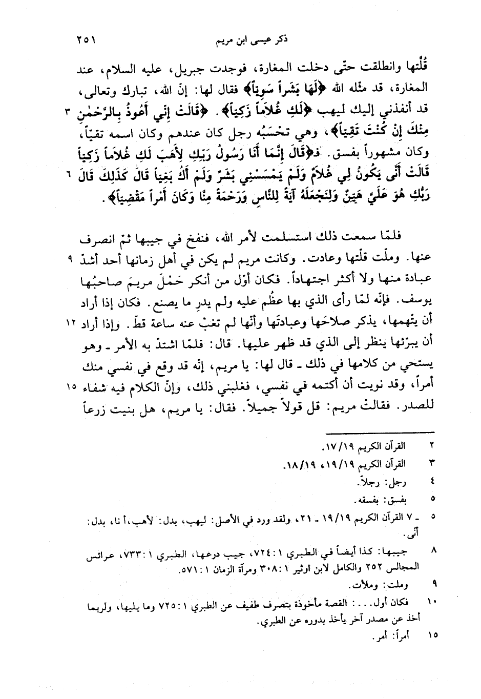 قلّتها وانطلقت حتّى دخلت المغارة، فوجدت جبريل، عليه السلام، عند المغارة، قد مثّله الله {لَها بَشَراً سَوِيًّا} فقال لها: إنّ الله، تبارك وتعالى، قد أنفذني إليك ليهب {لَكِ غُلاماً زَكِيًّا}. {قالَتْ إِنِّي أَعُوذُ بِالرَّحْمنِ مِنْكَ إِنْ كُنْتَ تَقِيًّا}، وهي تحسبه رجل كان عندهم وكان اسمه تقيّا، وكان مشهورا بفسق. ف {قالَ إِنَّما أَنَا رَسُولُ رَبِّكِ لِأَهَبَ لَكِ غُلاماً زَكِيًّا قالَتْ أَنّى يَكُونُ لِي غُلامٌ وَلَمْ يَمْسَسْنِي بَشَرٌ وَلَمْ أَكُ بَغِيًّا قالَ كَذلِكِ قالَ رَبُّكِ هُوَ عَلَيَّ هَيِّنٌ وَلِنَجْعَلَهُ آيَةً لِلنّاسِ وَرَحْمَةً مِنّا وَكانَ أَمْراً مَقْضِيًّا}.