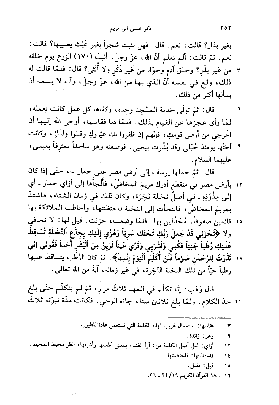 قال: ثمّ حملها يوسف إلى أرض مصر على حمار له، حتّى إذا كان بأرض مصر في منقطع أدرك مريم المخاض، فألجأها إلى أزاي حمار-أي إلى مذوذه-في أصل نخلة نخرة، وكان ذلك في زمان الشتاء، فاشتدّ بمريم المخاض، فالتجأت إلى النخلة فاحتظنتها، وأحاطت الملائكة بها قائمين صفوفا، محدّقين بها. فلمّا وضعت، حزنت. قيل لها: لا تخافي ولا {تَحْزَنِي قَدْ جَعَلَ رَبُّكِ تَحْتَكِ سَرِيًّا وَهُزِّي إِلَيْكِ بِجِذْعِ النَّخْلَةِ تُساقِطْ عَلَيْكِ رُطَباً جَنِيًّا فَكُلِي وَاِشْرَبِي وَقَرِّي عَيْناً فَإِمّا تَرَيِنَّ مِنَ الْبَشَرِ أَحَداً فَقُولِي إِنِّي نَذَرْتُ لِلرَّحْمنِ صَوْماً فَلَنْ أُكَلِّمَ الْيَوْمَ إِنْسِيًّا}. ثمّ كان الرّطب يتساقط عليها رطبا حيّا من تلك النخلة النّخرة، في غير زمانه، آية من الله تعالى.