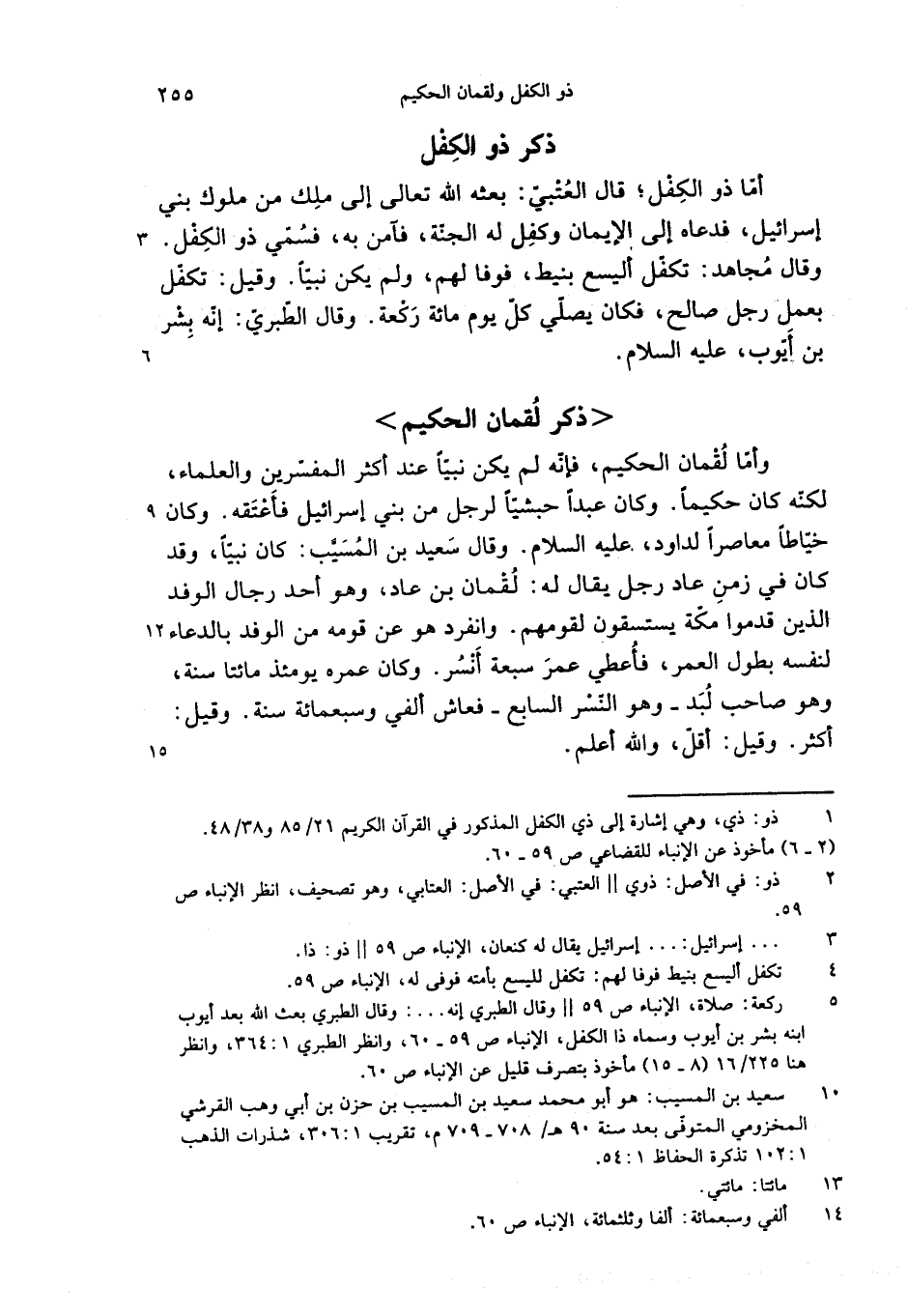 وأمّا لقمان الحكيم، فإنّه لم يكن نبيّا عند أكثر المفسّرين والعلماء، لكنّه كان حكيما. وكان عبدا حبشيّا لرجل من بني إسرائيل فأعتقه. وكان خيّاطا معاصرا لداود، عليه السلام. وقال سعيد بن المسيّب: كان نبيّا، وقد كان في زمن عاد رجل يقال له: لقمان بن عاد، وهو أحد رجال الوفد الذين قدموا مكّة يستسقون لقومهم. وانفرد هو عن قومه من الوفد بالدعاء لنفسه بطول العمر، فأعطي عمر سبعة أنسر. وكان عمره يومئذ مائتا سنة، وهو صاحب لبد-وهو النّسر السابع-فعاش ألفي وسبعمائة سنة. وقيل: