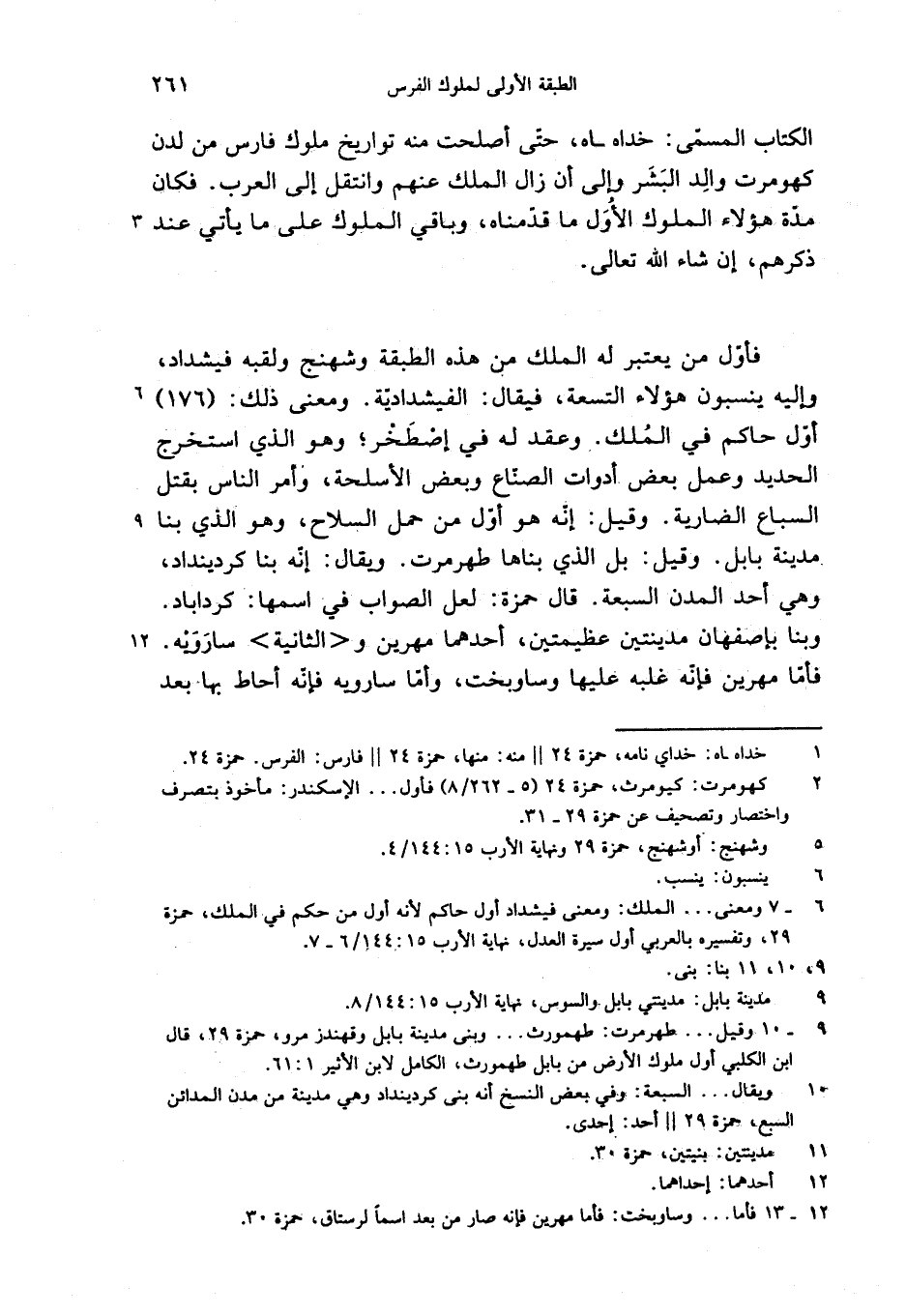 الكتاب المسمّى: خداه اه؟؟؟، حتّى أصلحت منه تواريخ ملوك فارس من لدن كهومرت والد البشر وإلى أن زال الملك عنهم وانتقل إلى العرب. فكان مدّة هؤلاء الملوك الأول ما قدّمناه، وباقي الملوك على ما يأتي عند ذكرهم، إن شاء الله تعالى.