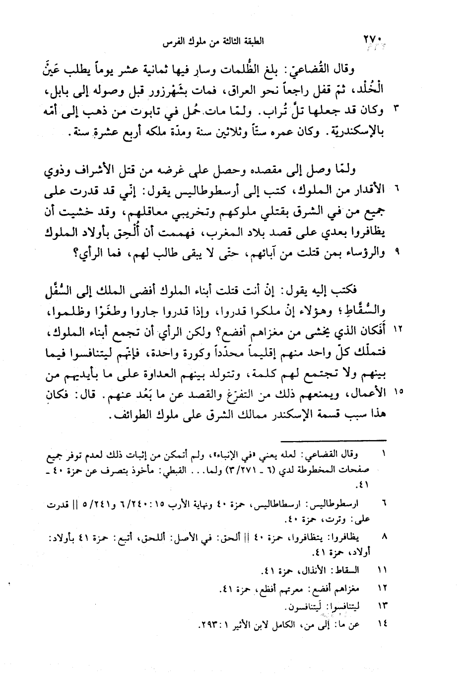 فكتب إليه يقول: إن أنت قتلت أبناء الملوك أفضى الملك إلى السّفّل والسّقّاط؛ وهؤلاء إن ملكوا قدروا، وإذا قدروا جاروا وطغوا وظلموا، أفكان الذي يخشى من مغزاهم أفضع؟ ولكن الرأي أن تجمع أبناء الملوك، فتملّك كلّ واحد منهم إقليما محدّدا وكورة واحدة، فإنّهم ليتنافسوا فيما بينهم ولا تجتمع لهم كلمة، وتتولد بينهم العداوة على ما بأيديهم من الأعمال، ويمنعهم ذلك من التفرّغ والقصد عن ما بعد عنهم. قال: فكان هذا سبب قسمة الإسكندر ممالك الشرق على ملوك الطوائف.
