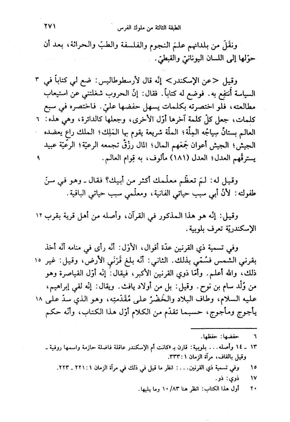 وقيل <عن الإسكندر> إنّه قال لأرسطوطاليس: ضع لي كتابا في السياسة أنتفع به. فوضع له كتابا. فقال: إنّ الحروب شغلتني عن استيعاب مطالعته، فلو اختصرته بكلمات يسهل حفضها عليّ. فاختصره في سبع كلمات، جعل كلّ كلمة آخرها أوّل الأخرى، وجعلها كالدائرة، وهي هذه: