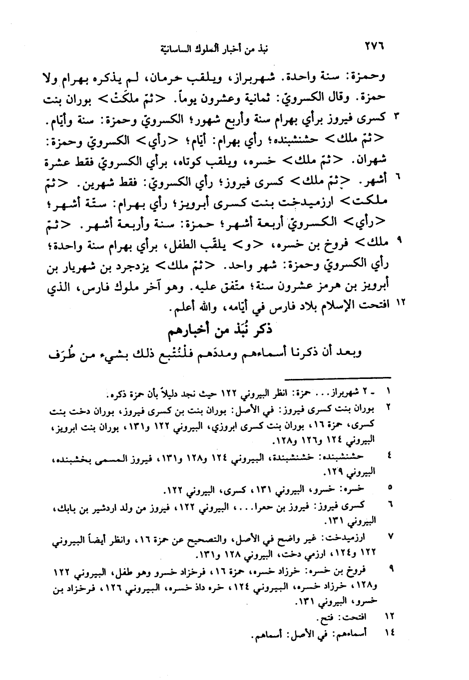 شهران. <ثمّ ملك> خسره، ويلقب كوتاه، برأي الكسرويّ فقط عشرة أشهر. <ثمّ ملك> كسرى فيروز؛ رأي الكسرويّ: فقط شهرين. <ثمّ ملكت> ارزميدخت بنت كسرى أبرويز؛ رأي بهرام: ستّة أشهر؛ <رأي> الكسرويّ أربعة أشهر؛ حمزة: سنة وأربعة أشهر. <ثمّ ملك> فروخ بن خسره، <و> يلقّب الطفل، برأي بهرام سنة واحدة؛ رأي الكسرويّ وحمزة: شهر واحد. <ثمّ ملك> يزدجرد بن شهريار بن أبرويز بن هرمز عشرون سنة؛ متّفق عليه. وهو آخر ملوك فارس، الذي افتحت الإسلام بلاد فارس في أيّامه، والله أعلم.