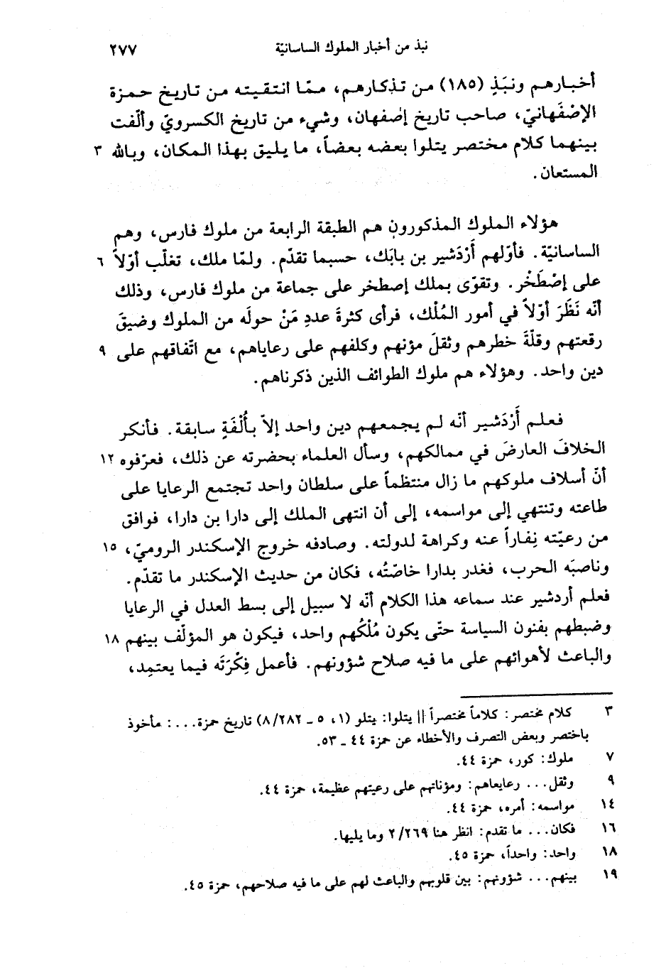 أخبارهم ونبذ (185) من تذكارهم، ممّا انتقيته من تاريخ حمزة الإصفهانيّ، صاحب تاريخ إصفهان، وشيء من تاريخ الكسرويّ وألّفت بينهما كلام مختصر يتلوا بعضه بعضا، ما يليق بهذا المكان، وبالله المستعان.