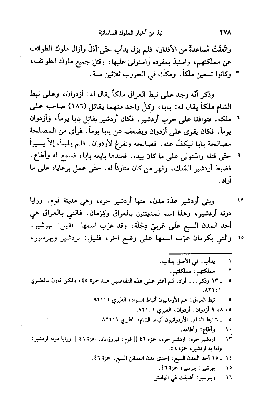 وذكر أنّه وجد على نبط العراق ملكا يقال له: أزدوان، وعلى نبط الشام ملكا يقال له: بابا، وكلّ واحد منهما يقاتل (186) صاحبه على ملكه. فتوافقا على حرب أردشير. فكان أردشير يقاتل بابا يوما، وأزدوان يوما. فكان يقوى على أزدوان ويضعف عن بابا يوما. فرأى من المصلحة مصالحة بابا ليكفّ عنه. فصالحه وتفرغ لأزدوان. فلم يلبث إلاّ يسيرا حتّى قتله واستولى على ما كان بيده. فعندها بايعه بابا، فسمع له وأطاع.