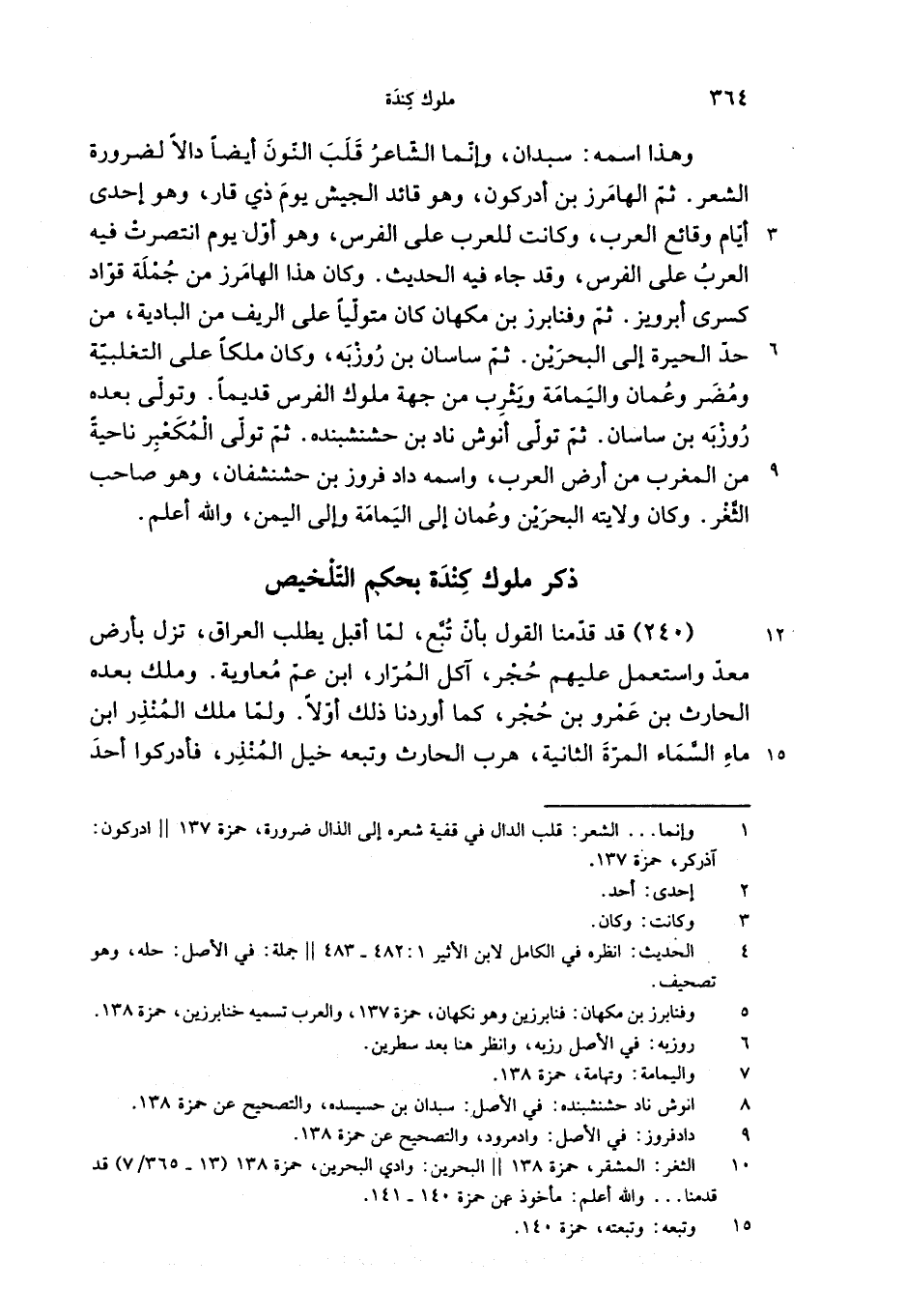 وهذا اسمه: سبدان، وإنّما الشّاعر قلب النّون أيضا دالا لضرورة الشعر. ثمّ الهامرز بن أدركون، وهو قائد الجيش يوم ذي قار، وهو إحدى أيّام وقائع العرب، وكانت للعرب على الفرس، وهو أوّل يوم انتصرت فيه العرب على الفرس، وقد جاء فيه الحديث. وكان هذا الهامرز من جملة قوّاد كسرى أبرويز. ثمّ وفنابرز بن مكهان كان متولّيا على الريف من البادية، من حدّ الحيرة إلى البحرين. ثمّ ساسان بن روزبه، وكان ملكا على التغلبيّة ومضر وعمان واليمامة ويثرب من جهة ملوك الفرس قديما. وتولّى بعده روزبه بن ساسان. ثمّ تولّى أنوش ناد بن حشنشبنده. ثمّ تولّى المكعبر ناحية من المغرب من أرض العرب، واسمه داد فروز بن حشنشفان، وهو صاحب الثّغر. وكان ولايته البحرين وعمان إلى اليمامة وإلى اليمن، والله أعلم.