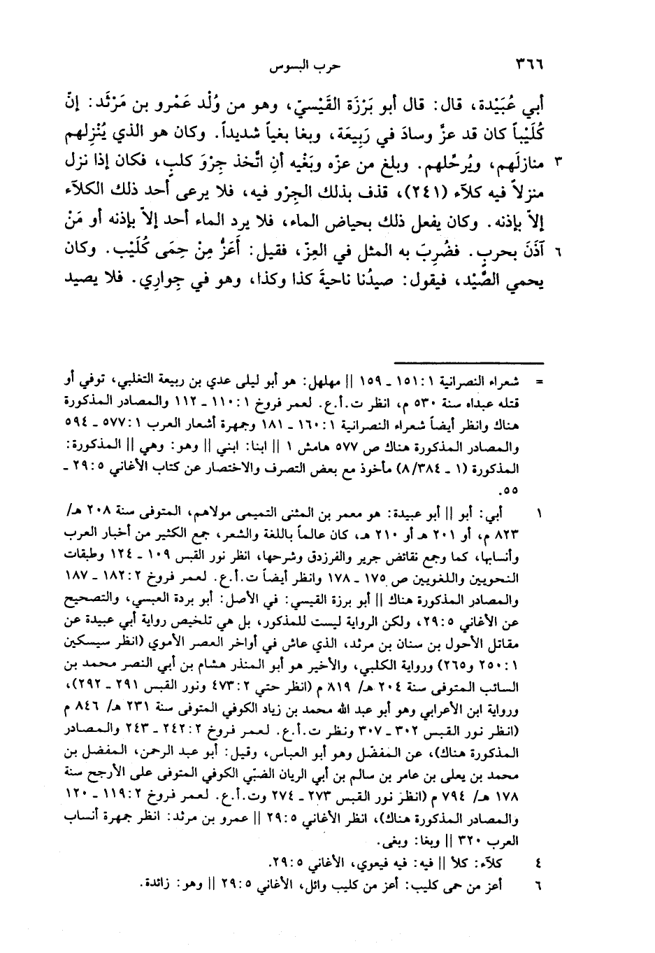 أبي عبيدة، قال: قال أبو برزة القيسيّ، وهو من ولد عمرو بن مرثد: إنّ كليبا كان قد عزّ وساد في ربيعة، وبغا بغيا شديدا. وكان هو الذي ينزلهم منازلهم، ويرحّلهم. وبلغ من عزّه وبغيه أن اتّخذ جرو كلب، فكان إذا نزل منزلا فيه كلآء (241)، قذف بذلك الجرو فيه، فلا يرعى أحد ذلك الكلآء إلاّ بإذنه. وكان يفعل ذلك بحياض الماء، فلا يرد الماء أحد إلاّ بإذنه أو من آذن بحرب. فضرب به المثل في العزّ، فقيل: أعزّ من حمى كليب. وكان يحمي الصّيد، فيقول: صيدنا ناحية كذا وكذا، وهو في جواري. فلا يصيد