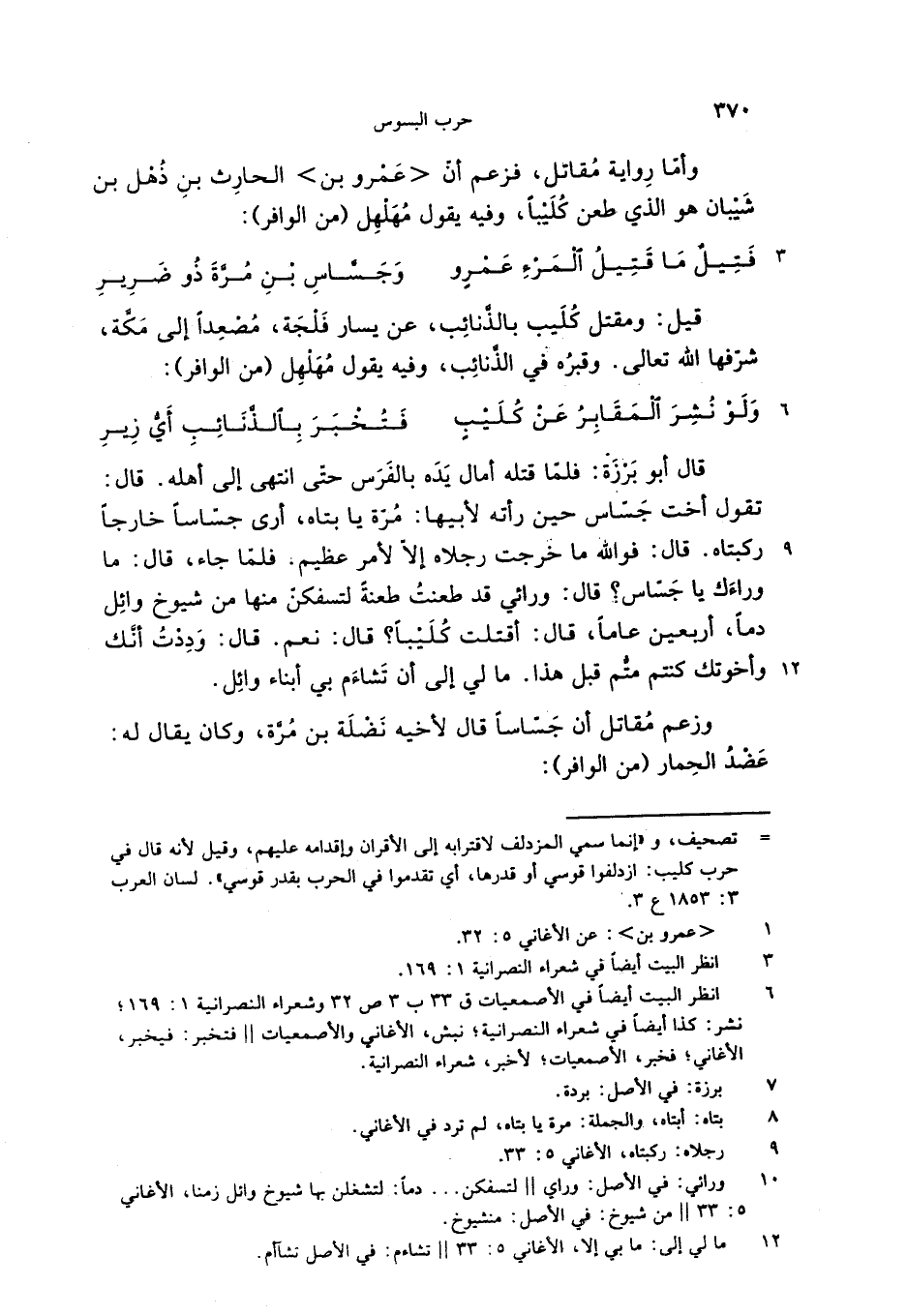 وأمّا رواية مقاتل، فزعم أنّ <عمرو بن> الحارث بن ذهل بن شيبان هو الذي طعن كليبا، وفيه يقول مهلهل (من الوافر):