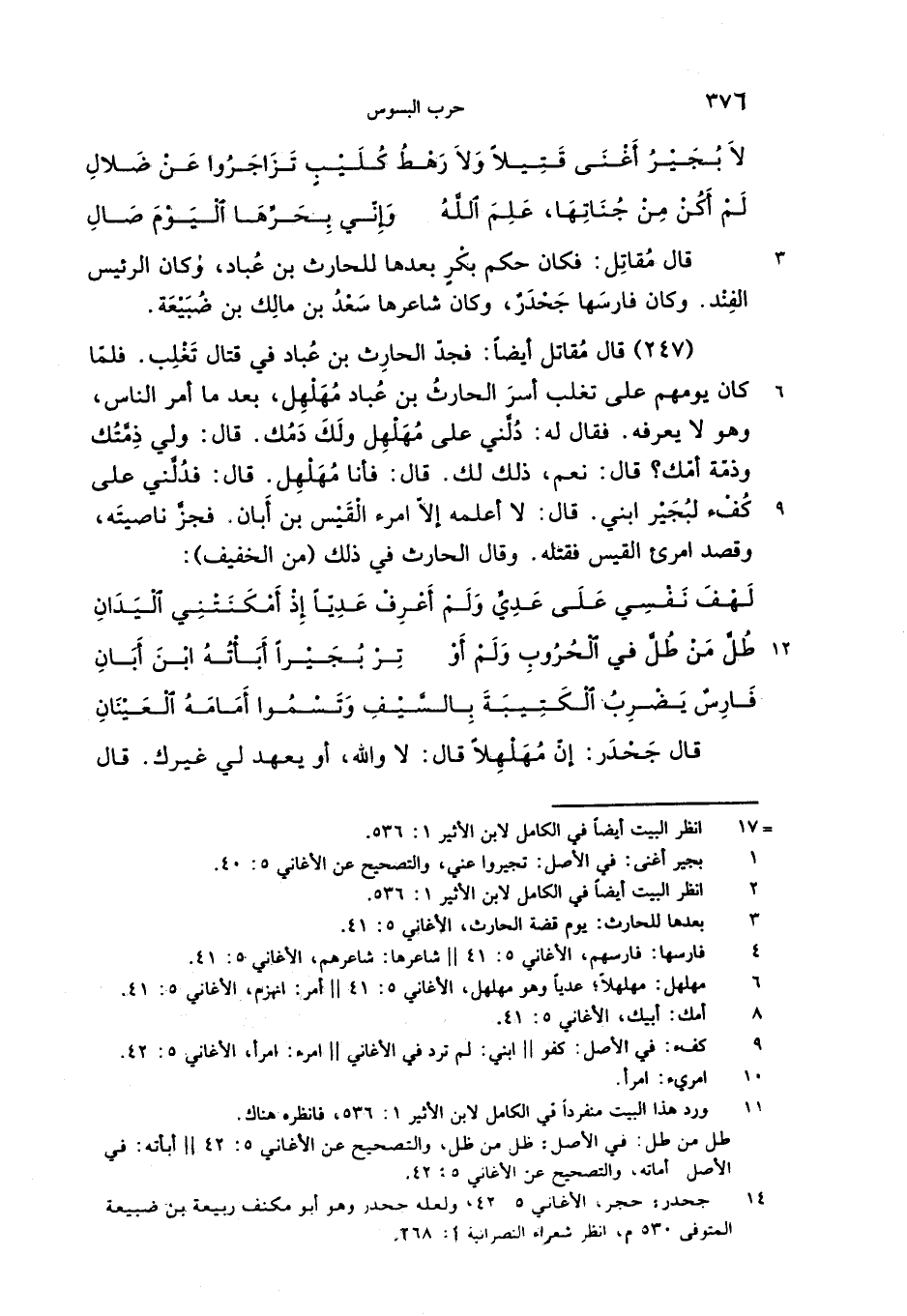 (247) قال مقاتل أيضا: فجدّ الحارث بن عباد في قتال تغلب. فلمّا كان يومهم على تغلب أسر الحارث بن عباد مهلهل، بعد ما أمر الناس، وهو لا يعرفه. فقال له: دلّني على مهلهل ولك دمك. قال: ولي ذمّتك وذمّة أمّك؟ قال: نعم، ذلك لك. قال: فأنا مهلهل. قال: فدلّني على كفء لبجير ابني. قال: لا أعلمه إلاّ امرء القيس بن أبان. فجزّ ناصيته، وقصد امرئ القيس فقتله. وقال الحارث في ذلك (من الخفيف):