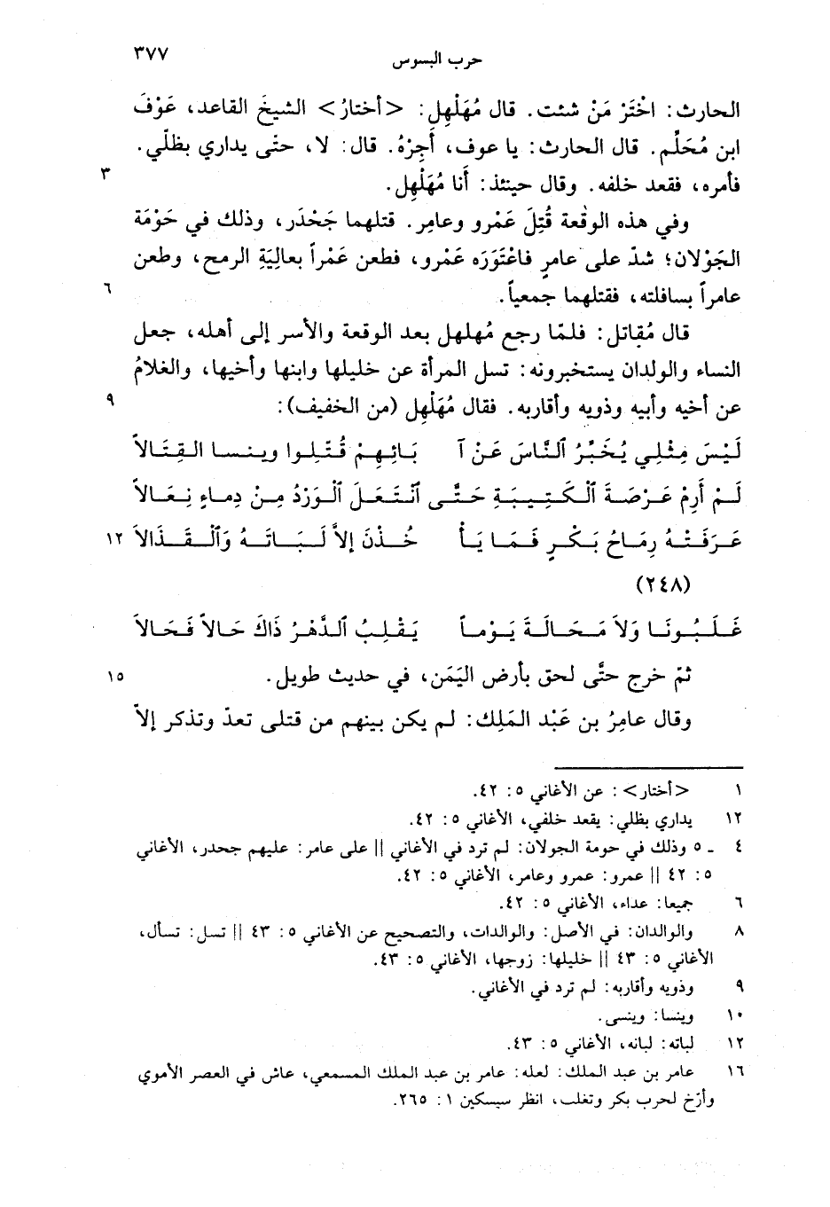 الحارث: اختر من شئت. قال مهلهل: <أختار> الشيخ القاعد، عوف ابن محلّم. قال الحارث: يا عوف، أجره. قال: لا، حتّى يداري بظلّي.