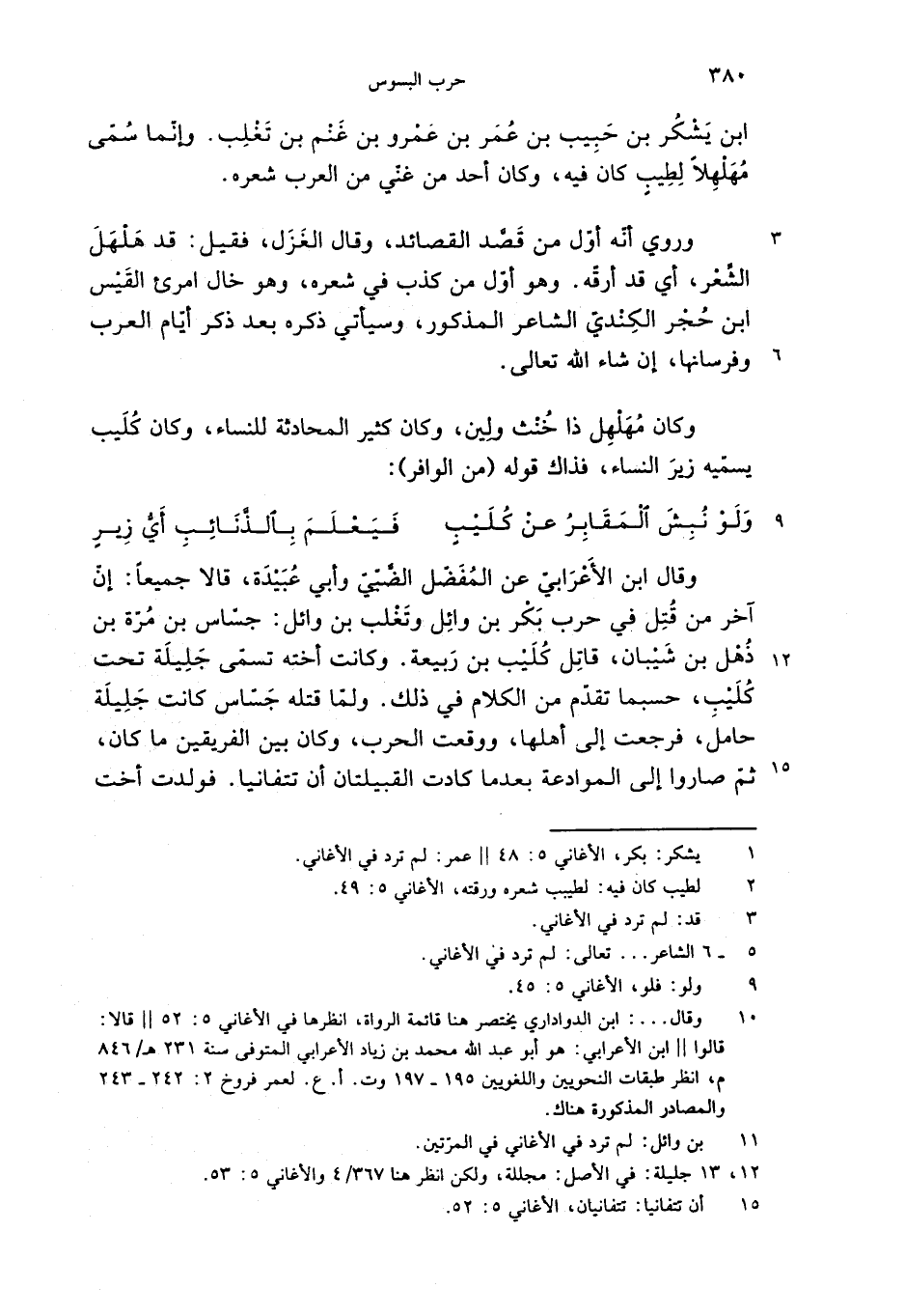 وقال ابن الأعرابيّ عن المفضّل الضّبّيّ وأبي عبيدة، قالا جميعا: إنّ آخر من قتل في حرب بكر بن وائل وتغلب بن وائل: جسّاس بن مرّة بن ذهل بن شيبان، قاتل كليب بن ربيعةأو كانت أخته تسمّى جليلة تحت كليب، حسبما تقدّم من الكلام في ذلك. ولمّا قتله جسّاس كانت جليلة حامل، فرجعت إلى أهلها، ووقعت الحرب، وكان بين الفريقين ما كان، ثمّ صاروا إلى الموادعة بعدما كادت القبيلتان أن تتفانيا. فولدت أخت