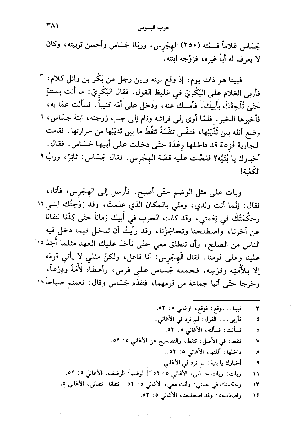 وبات على مثل الوضم حتّى أصبح. فأرسل إلى الهجرس، فأتاه، فقال: إنّما أنت ولدي، ومنّي بالمكان الذي علمت، وقد زوّجتك ابنتي وحكّمتك في نعمتي، وقد كانت الحرب في أبيك زمانا حتّى كدنا نتفانا عن آخرنا، واصطلحنا وتحاجزنا، وقد رأيت أن تدخل فيما دخل فيه الناس من الصلح، وأن تنطلق معي حتّى نأخذ عليك العهد مثلما أخذ علينا وعلى قومنا. فقال الهجرس: أنا فاعل، ولكنّ مثلي لا يأتي قومه إلا بلأمته وفرسه، فحمله جّساس على فرس، وأعطاه لأمة ودرعا، وخرجا حتّى أتيا جماعة من قومهما، فتقدّم جسّاس وقال: نعمتم صباحا