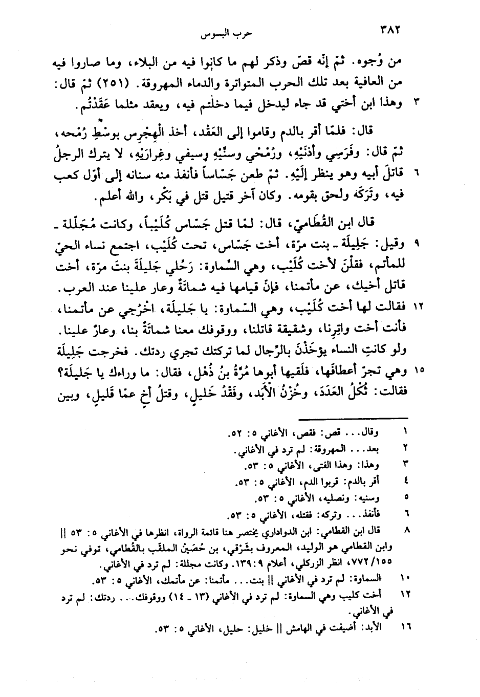 فقالت لها أخت كليب، وهي السّماوة: يا جليلة، اخرجي عن مأتمنا، فأنت أخت واترنا، وشقيقة قاتلنا، ووقوفك معنا شماتة بنا، وعار علينا.