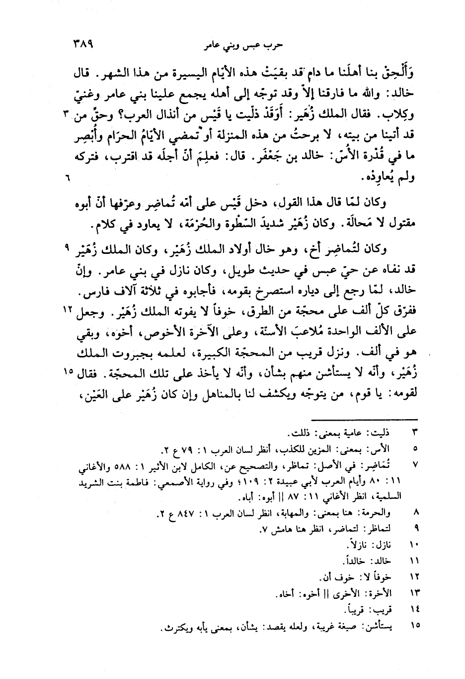 وألحق بنا أهلنا ما دام قد بقيت هذه الأيّام اليسيرة من هذا الشهر. قال خالد: والله ما فارقنا إلاّ وقد توجّه إلى أهله يجمع علينا بني عامر وغنيّ وكلاب. فقال الملك زهير: أوقد ذلّيت يا قيس من أنذال العرب؟ وحقّ من قد أتينا من بيته، لا برحت من هذه المنزلة أو تمضي الأيّام الحرام وأبصر ما في قدرة الأسّ: خالد بن جعفر. قال: فعلم أنّ أجله قد اقترب، فتركه ولم يعاوده.