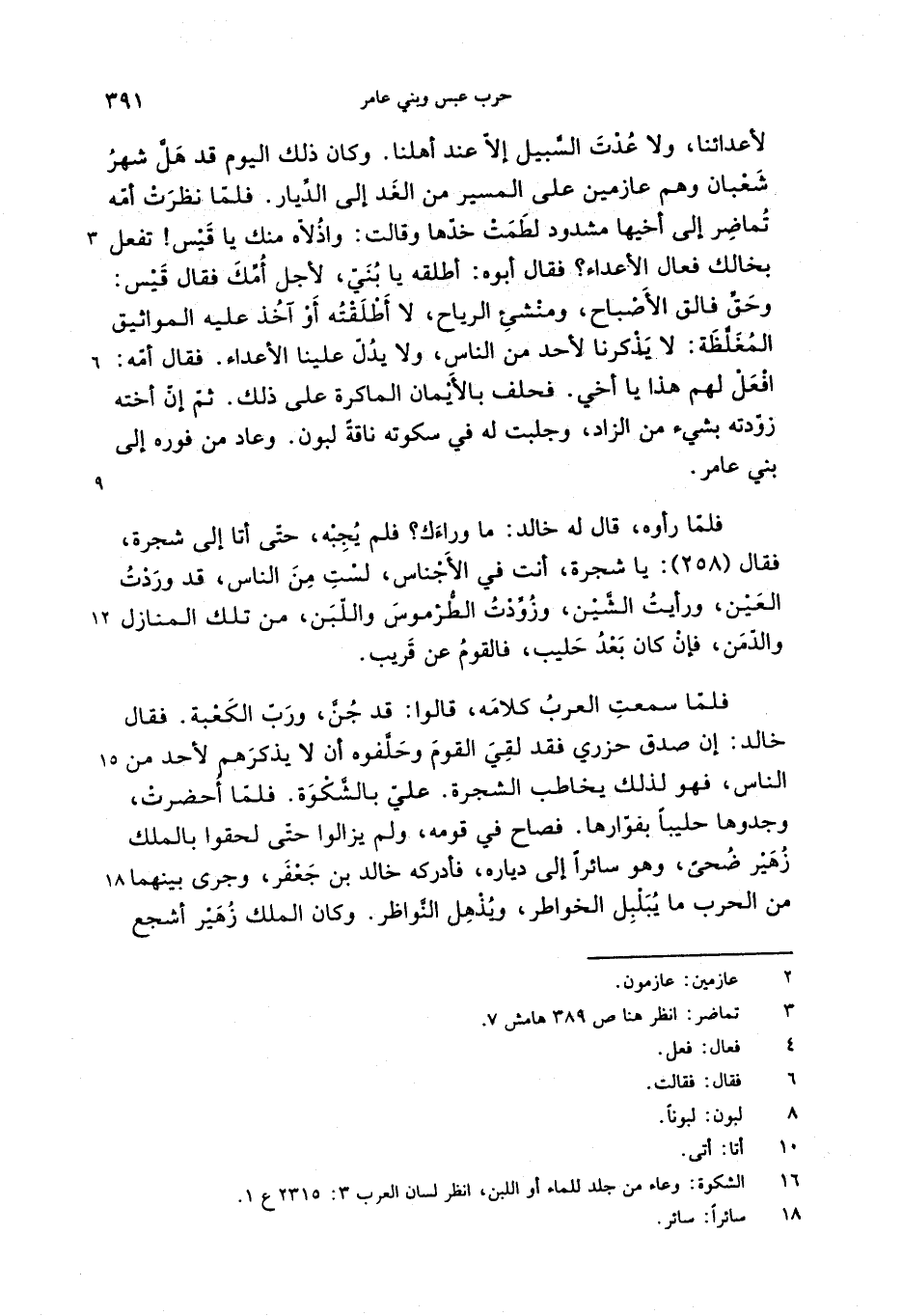 فلمّا سمعت العرب كلامه، قالوا: قد جنّ، وربّ الكعبة. فقال خالد: إن صدق حزري فقد لقي القوم وحلّفوه أن لا يذكرهم لأحد من الناس، فهو لذلك يخاطب الشجرة. عليّ بالشّكوة. فلمّا أحضرت، وجدوها حليبا بفوّارها. فصاح في قومه، ولم يزالوا حتّى لحقوا بالملك زهير ضحى، وهو سائرا إلى دياره، فأدركه خالد بن جعفر، وجرى بينهما من الحرب ما يبلبل الخواطر، ويذهل النّواظر. وكان الملك زهير أشجع
