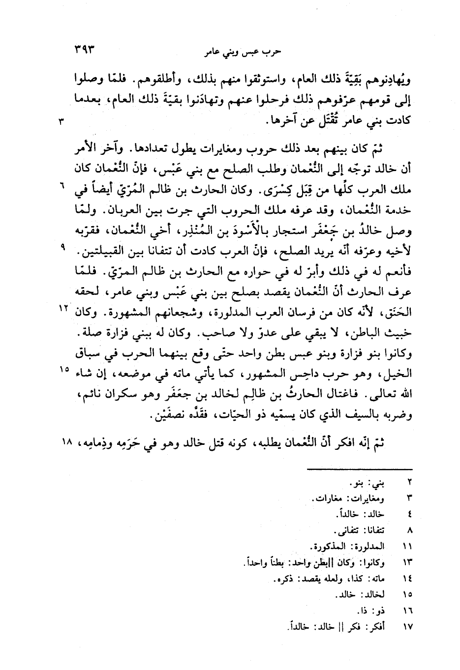 ثمّ كان بينهم بعد ذلك حروب ومغايرات يطول تعدادها. وآخر الأمر أن خالد توجّه إلى النّعمان وطلب الصلح مع بني عبس، فإنّ النّعمان كان ملك العرب كلّها من قبل كسرى. وكان الحارث بن ظالم المرّيّ أيضا في خدمة النّعمان، وقد عرفه ملك الحروب التي جرت بين العربان. ولمّا وصل خالد بن جعفر استجار بالأسود بن المنذر، أخي النّعمان، فقرّبه لأخيه وعرّفه أنّه يريد الصلح، فإنّ العرب كادت أن تتفانا بين القبيلتين.