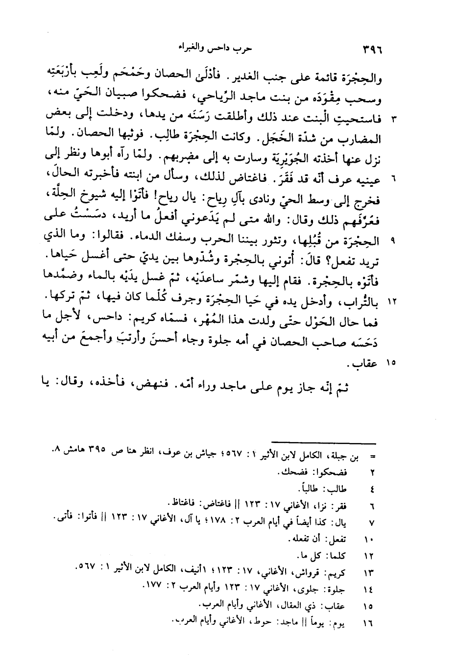 والحجرة قائمة على جنب الغدير. فأدلى الحصان وحمحم ولعب بأربعته وسحب مقوده من بنت ماجد الرّياحي، فضحكوا صبيان الحيّ منه، فاستحيت البنت عند ذلك وأطلقت رسنه من يدها، ودخلت إلى بعض المضارب من شدّة الخجل. وكانت الحجرة طالب. فوثبها الحصان. ولمّا نزل عنها أخذته الجويرية وسارت به إلى مضربهم. ولمّا رآه أبوها ونظر إلى عينيه عرف أنّه قد فقر. فاغتاض لذلك، وسأل من ابنته فأخبرته الحال، فخرج إلى وسط الحيّ ونادى بآل رياح: يال رياح! فأتوا إليه شيوخ الحلّة، فعرّفهم ذلك وقال: والله متى لم يدعوني أفعل ما أريد، دسست على الحجرة من قبلها، وتثور بيننا الحرب وسفك الدماء. فقالوا: وما الذي تريد تفعل؟ قال: أتوني بالحجرة وشدّوها بين يديّ حتى أغسل حياها.