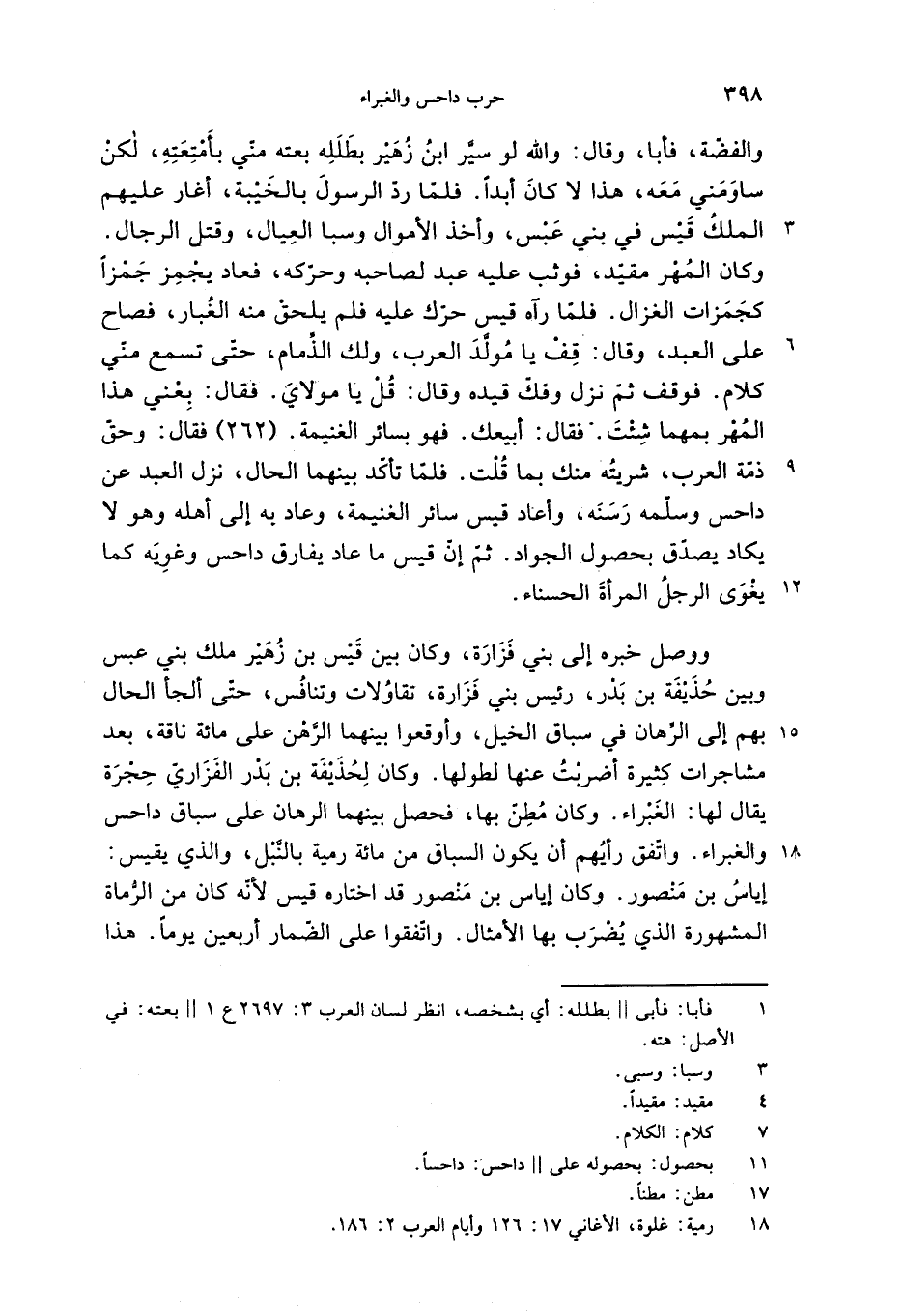 والفضّة، فأبا، وقال: والله لو سيّر ابن زهير بطلله بعته منّي بأمتعته، لكن ساومني معه، هذا لا كان أبدا. فلمّا ردّ الرسول بالخيبة، أغار عليهم الملك قيس في بني عبس، وأخذ الأموال وسبا العيال، وقتل الرجال.