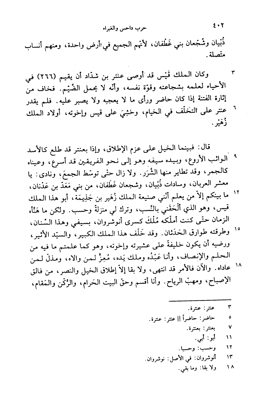 قال: فبينما الخيل على عزم الإطلاق، وإذا بعنتر قد طلع كالأسد الواثب الأروع، وبيده سيفه وهو إلى نحو الفريقين قد أسرع، وعيناه كالجمر، وقد تطاير منها الشّرر. ولا زال حتّى توسّط الجمع، ونادى: يا معشر العربان، وسادات ذبيان، وشجعان غطفان، من بني معدّ بن عدنان، ما بينكم إلاّ من يعلم أنّني صنيعة الملك زهير بن جذيمة، أبو هذا الملك قيس، وهو الذي الحقني بالنّسب، وترك لي منزلة وحسب. ولكن ما هنّأه الزمان حتّى كنت أملّكه ملك كسرى أنوشروان، بسيفي وهذا السّنان، وطرقته طوارق الحدثان. وقد خلّف هذا الملك الكبير، والسيّد الأثير، ورضيه أن يكون خليفة على عشيرته وإخوته، وهو كما علمتم ما فيه من الحلم والإنصاف، وأنا عبده وملك يده، معزّ لمن والاه، ومذلّ لمن عاداه. والآن فالأمر قد انتهى، ولا بقا إلاّ إطلاق الخيل والنصر، من فالق الإصباح، ومهبّ الرياح. وأنا أقسم وحقّ البيت الحرام، والرّكن والمقام،