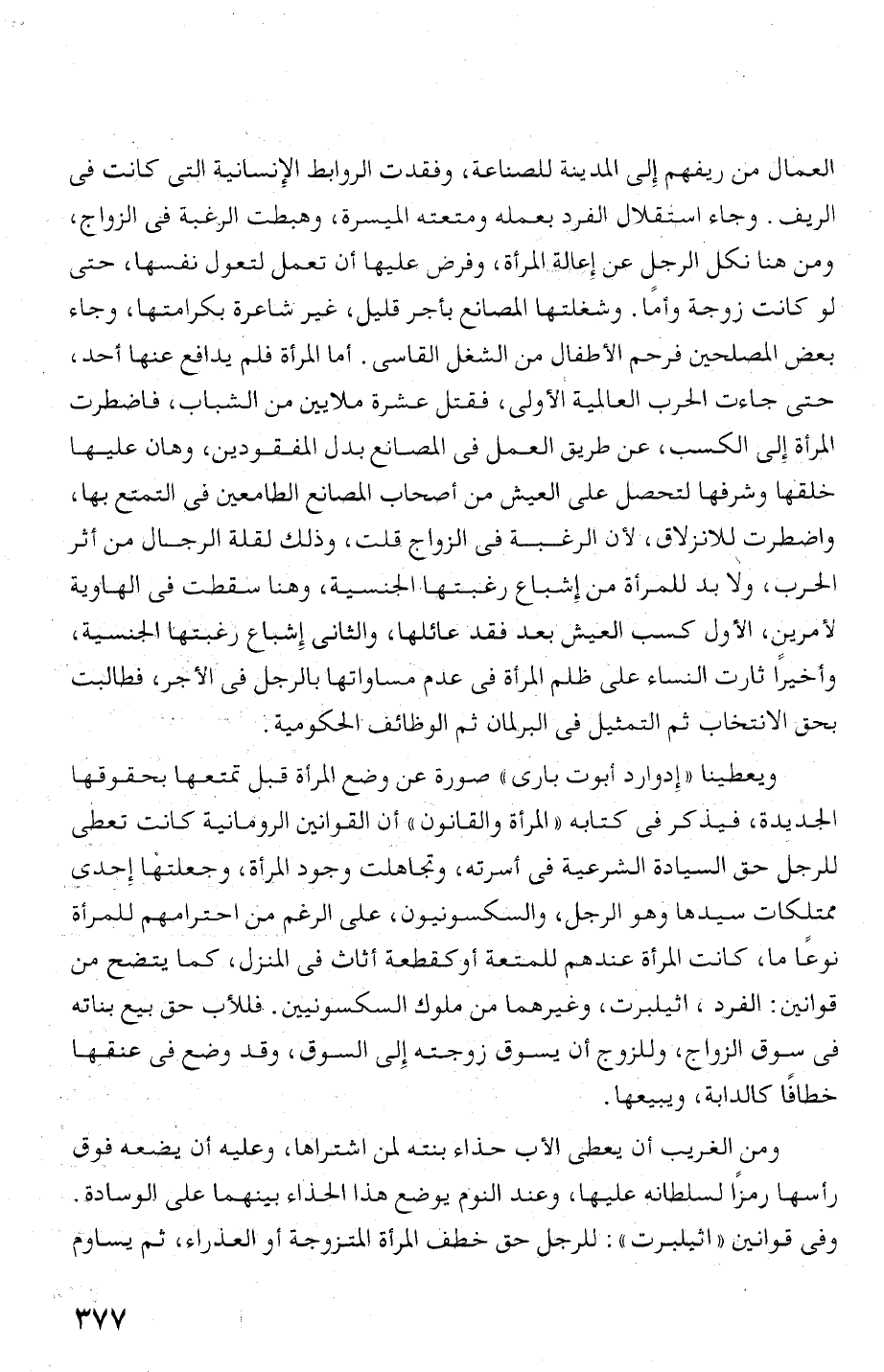 ومن هنا نكل الرجل عن إعالة المرأة، وفرضر عليها أن تعمل لتعول نفسها، حتى