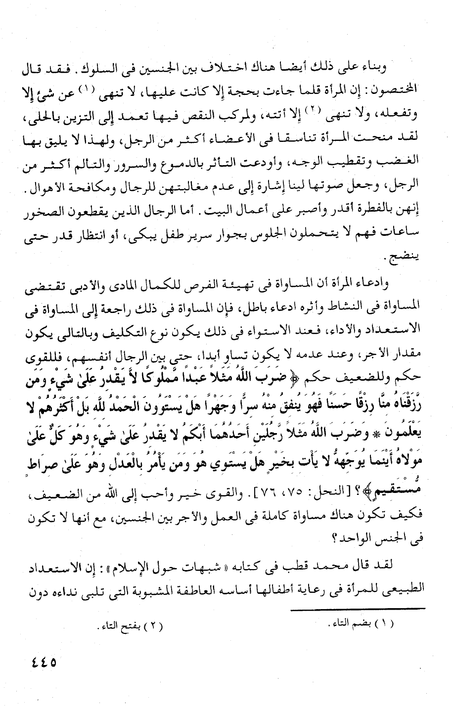 وادعاء المرأة أن المساواة فى تهيئة الفرص للكمال المادى والأ دبى تقتضى