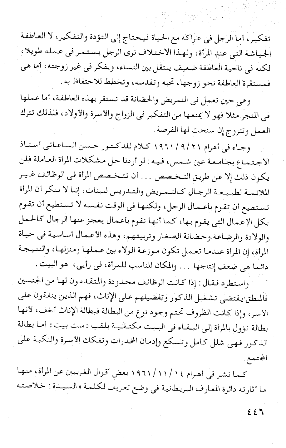 دائما هى ضعف إنتاجها. . . والمكان المناسب للمرأة، فى رأيى، هو البيت.