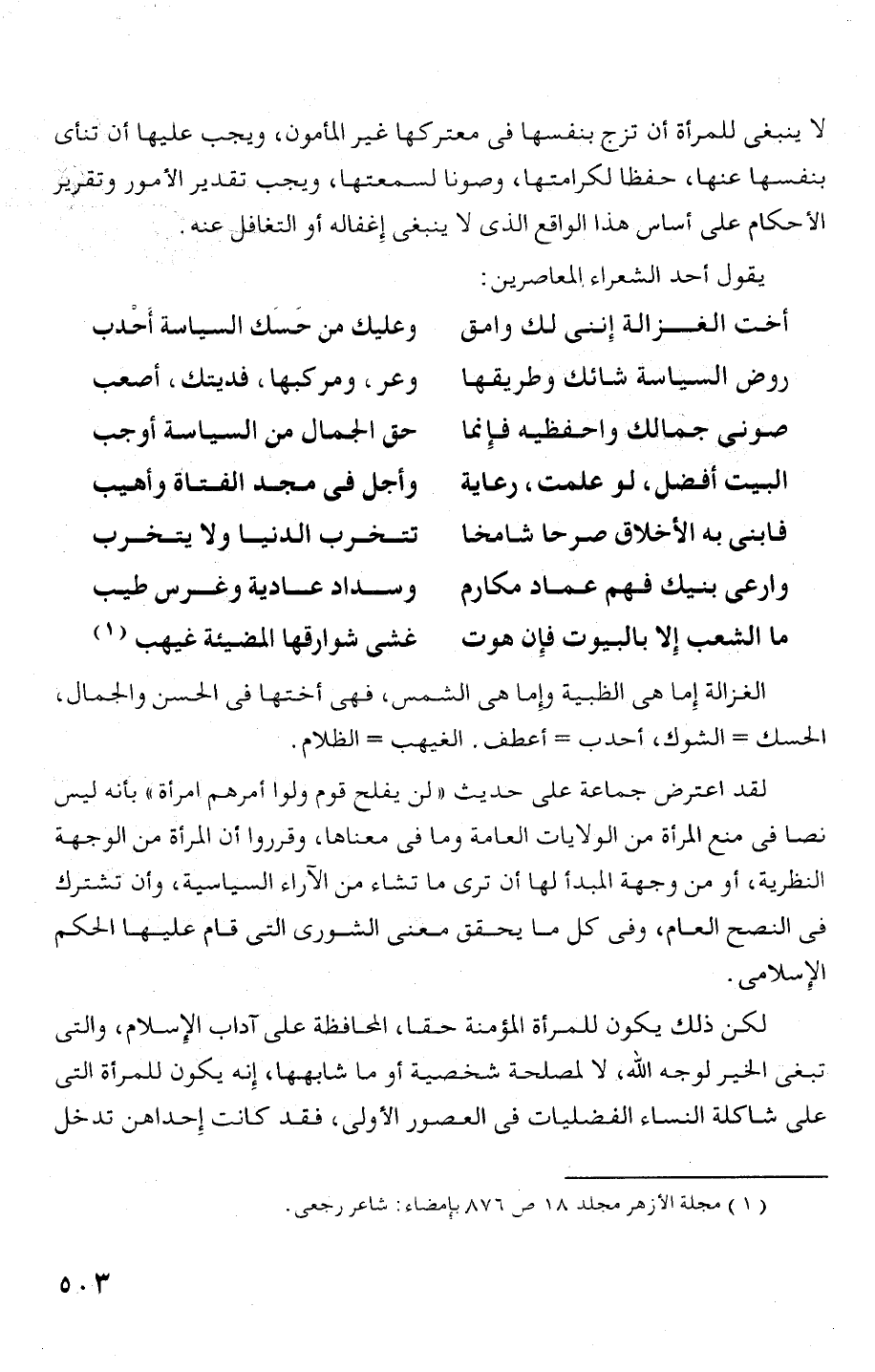 لا ينبغى للمرأة أن تزج بنفسها فى معتركها غير المأمون، ويجب عليها أن تنأى