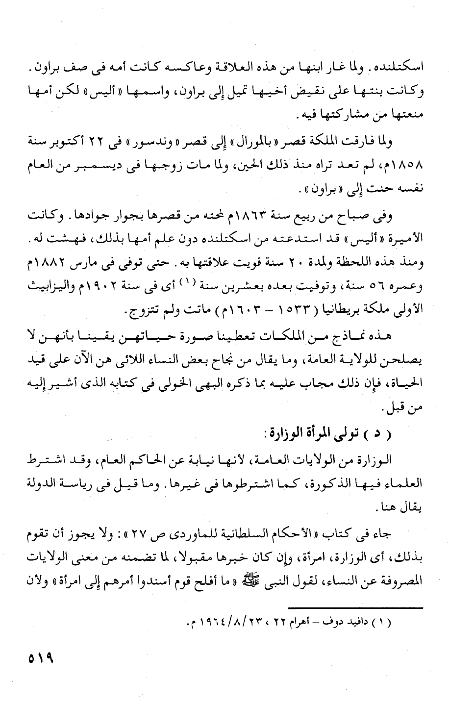 جاء فى كتاب " الأ حكام السلطانية للماوردى ص 27)): ولا يجوز أن تقوم