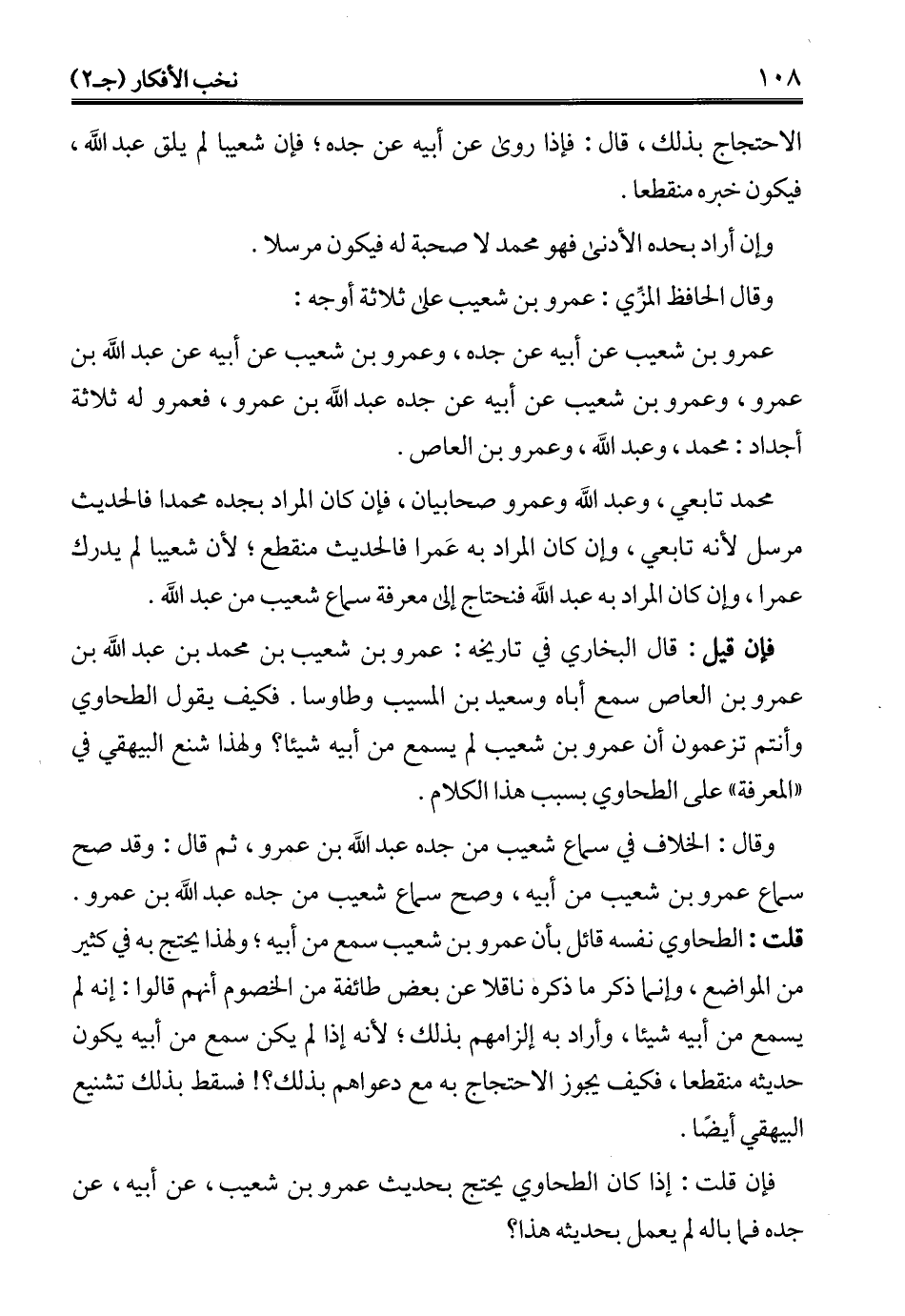 فإن قيل: قال البخاري في تاريخه: عمرو بن شعيب بن محمَّد بن عبد الله بن عمرو بن العاص سمع أباه وسعيد بن المسيب وطاوسا. فكيف يقول الطحاوي وأنتم تزعمون أن عمرو بن شعيب لم يسمع من أبيه شيئًا؟ ولهذا شنع البيهقي في "المعرفة" على الطحاوي بسبب هذا الكلام.