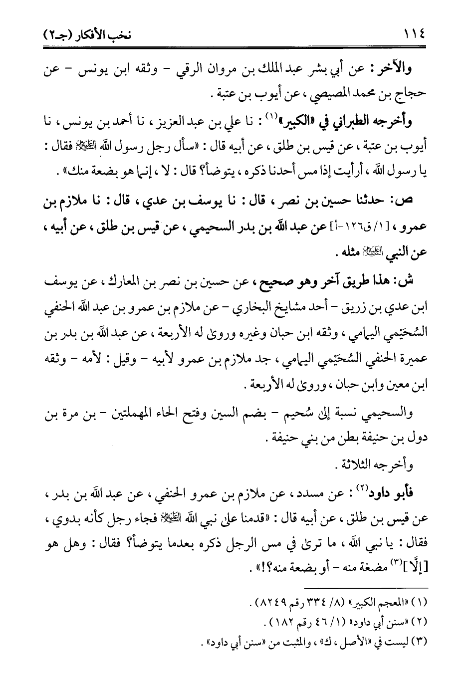 فأبو داود (¬2): عن مسدد، عن ملازم بن عمرو الحنفي، عن عبد الله بن بدر، عن قيس بن طلق، عن أبيه قال: "قدمنا على نبي الله - عليه السلام - فجاء رجل كأنه بدوي، فقال: يا نبي الله، ما ترى في مس الرجل ذكره بعد ما يتوضأ؟ فقال: وهل هو [إلَّا] (¬3) مضغة منه- أو بضعة منه؟! ".