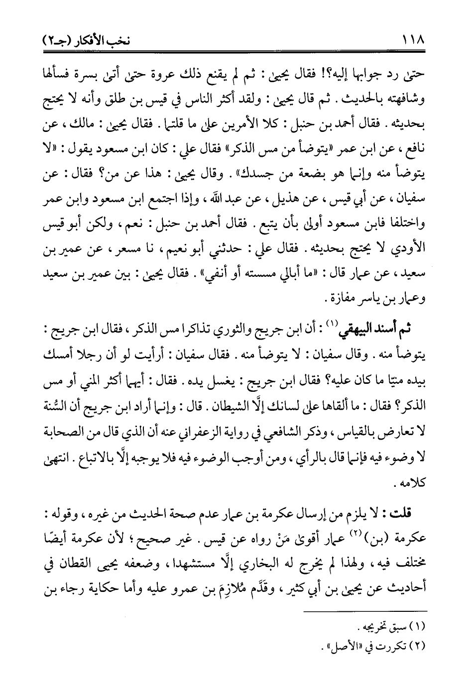 حتى رد جوابها إليه؟! فقال يحيى: ثم لم يقنع ذلك عروة حتى أتى بسرة فسألها وشافهته بالحديث. ثم قال يحيى: ولقد أكثر الناس في قيس بن طلق وأنه لا يحتج بحديثه. فقال أحمد بن حنبل: كلا الأمرين على ما قلتما. فقال يحيى: مالك، عن نافع، عن ابن عمر "يتوضأ من مس الذكر" فقال علي: كان ابن مسعود يقول: "لا يتوضأ منه وإنما هو بضعة من جسدك". وقال يحيى: هذا عن من؟ فقال: عن سفيان، عن أبي قيس، عن هذيل، عن عبد الله، وإذا اجتمع ابن مسعود وابن عمر واختلفا فابن مسعود أولى بأن يتبع. فقال أحمد بن حنبل: نعم، ولكن أبو قيس الأودي لا يحتج بحديثه. فقال علي: حدثني أبو نعيم، نا مسعر، عن عمير بن سعيد، عن عمار قال: "ما أبالي مسسته أو أنفي". فقال يحيى: بين عمير بن سعيد وعمار بن ياسر مفازة.