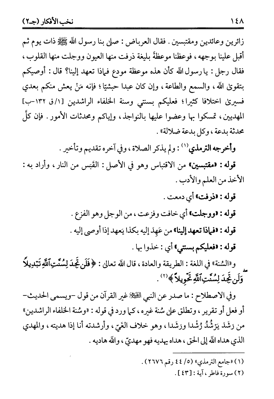 زائرين وعائدين ومقتبسين. فقال العرباض: صلى بنا رسول الله - صلى الله عليه وسلم - ذات يوم ثم أقبل علينا بوجهه، فوعظنا موعظة بليغة ذرفت منها العيون ووجلت منها القلوب، فقال رجل: يا رسول الله كأن هذه موعظة مودع فماذا تعهد إلينا؟ قال: أوصيكم بتقوى الله، والسمع والطاعة، وإن كان عبدا حبشيّا؛ فإنه مَنْ يعش منكم بعدي فسيرى اختلافا كثيرا؛ فعليكم بسنتي وسنة الخلفاء الراشدين المهديين، تمسكوا بها وعضوا عليها بالنواجذ، وإياكم ومحدثات الأمور. فإن كلَّ محدثة بدعة، وكل بدعة ضلالة".