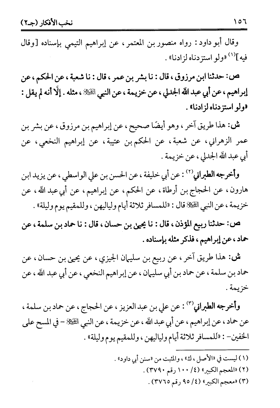 وأخرجه الطبراني (¬3): عن علي بن عبد العزيز، عن الحجاج، عن حماد بن سلمة، عن حماد، عن إبراهيم، عن أبي عبد الله، عن خزيمة، عن النبي - عليه السلام - في المسح على الخفين-: "للمسافر ثلاثة أيام ولياليهن، وللمقيم يوم وليلة".