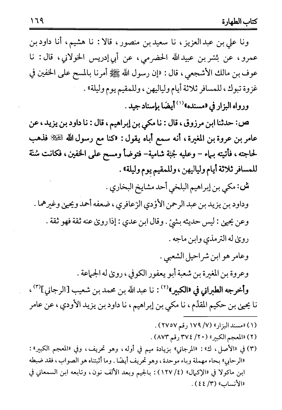 ونا علي بن عبد العزيز، نا سعيد بن منصور، قالا: نا هشيم، أنا داود بن عمرو، عن بُسْر بن عبيد الله الحضرمي، عن أبي إدريس الخولاني، قال: نا عوف بن مالك الأشجعي، قال: "إن رسول الله - صلى الله عليه وسلم - أمرنا بالمسح على الخفين في غزوة تبوك، للمسافر ثلاثة أيام ولياليهن، وللمقيم يوم وليلة".