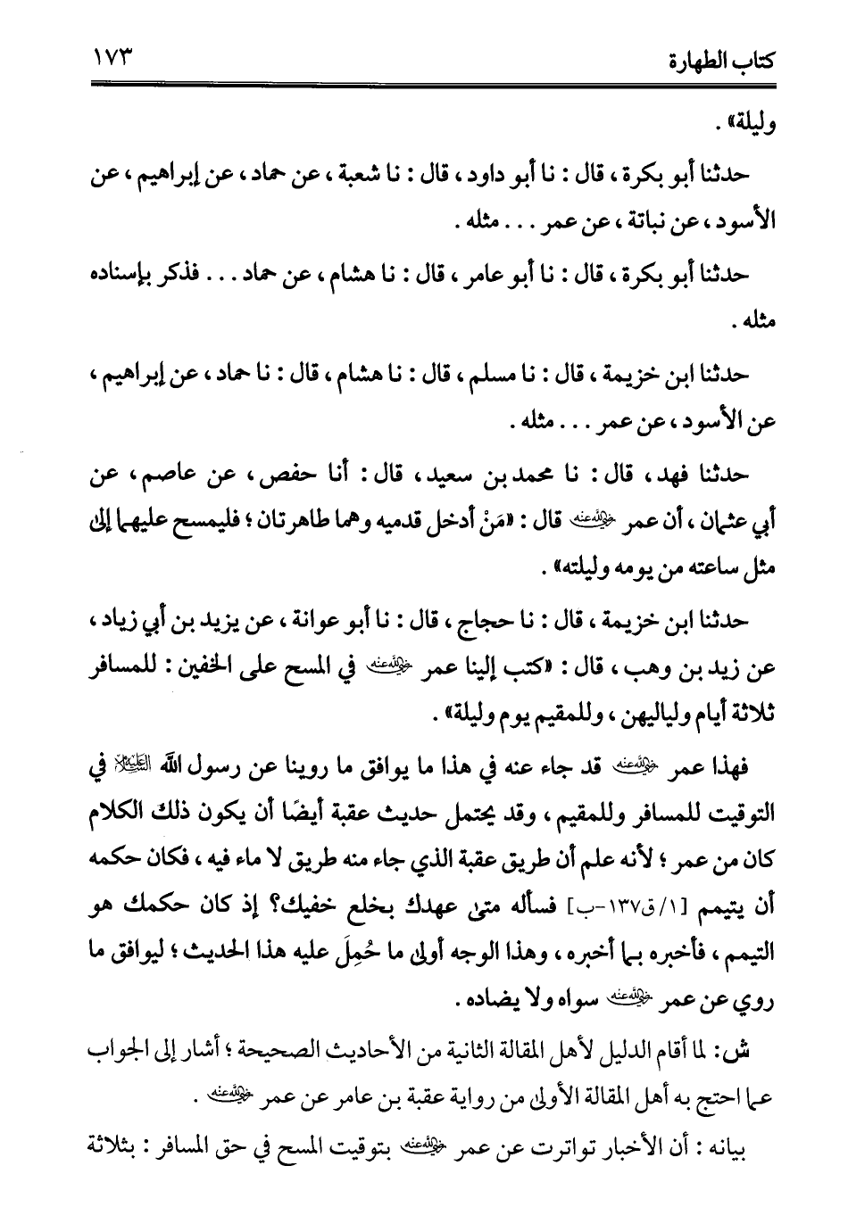 حدثنا ابن خزيمة، قال: نا حجاج، قال: نا أبو عوانة، عن يزيد بن أبي زياد، عن زيد بن وهب، قال: "كتب إلينا عمر - رضي الله عنه - في المسح على الخفين: للمسافر ثلاثة أيام ولياليهن، وللمقيم يوم وليلة".