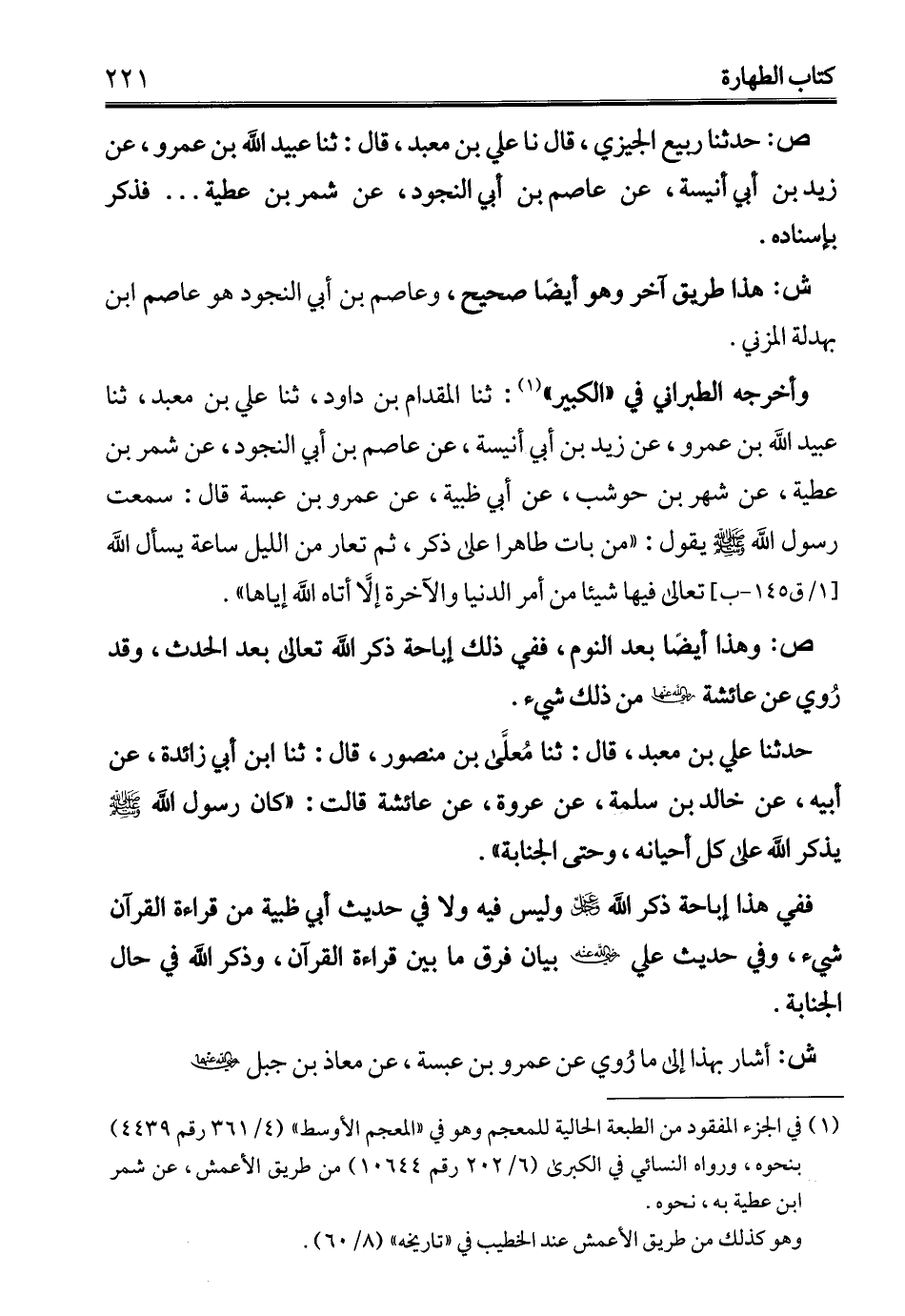 حدثنا علي بن معبد، قال: ثنا مُعلَّى بن منصور، قال: ثنا ابن أبي زائدة، عن أبيه، عن خالد بن سلمة، عن عروة، عن عائشة قالت: "كان رسول الله - صلى الله عليه وسلم - يذكر الله على كل أحيانه، وحتى الجنابة".