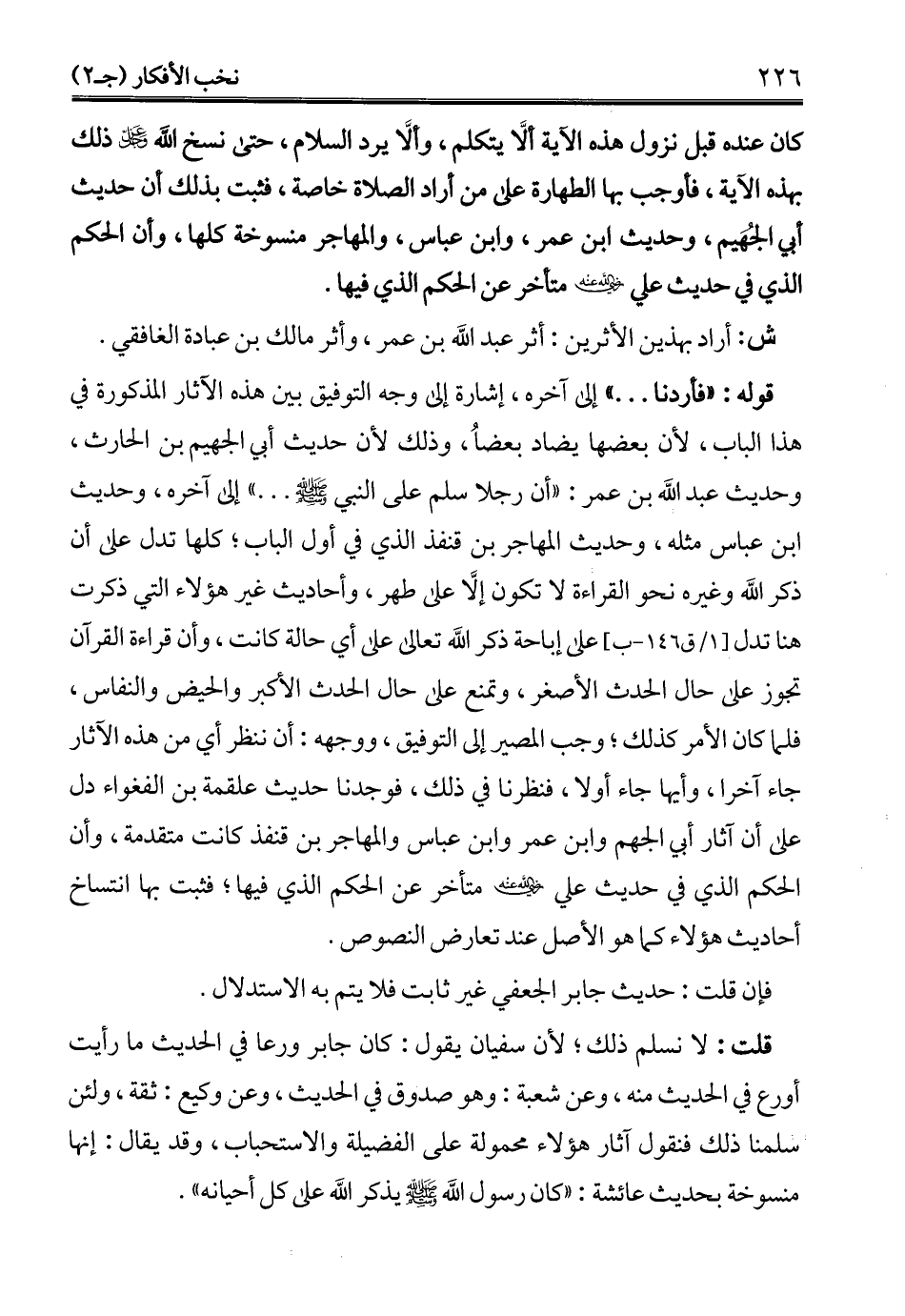 كان عنده قبل نزول هذه الآية ألَّا يتكلم، وألَّا يرد السلام، حتى نسخ الله -عز وجل- ذلك بهذه الآية، فأوجب بها الطهارة على من أراد الصلاة خاصة، فثبت بذلك أن حديث أبي الجُهيم، وحديث ابن عمر، وابن عباس، والمهاجر منسوخة كلها، وأن الحكم الذي في حديث علي - رضي الله عنه - متأخر عن الحكم الذي فيها.